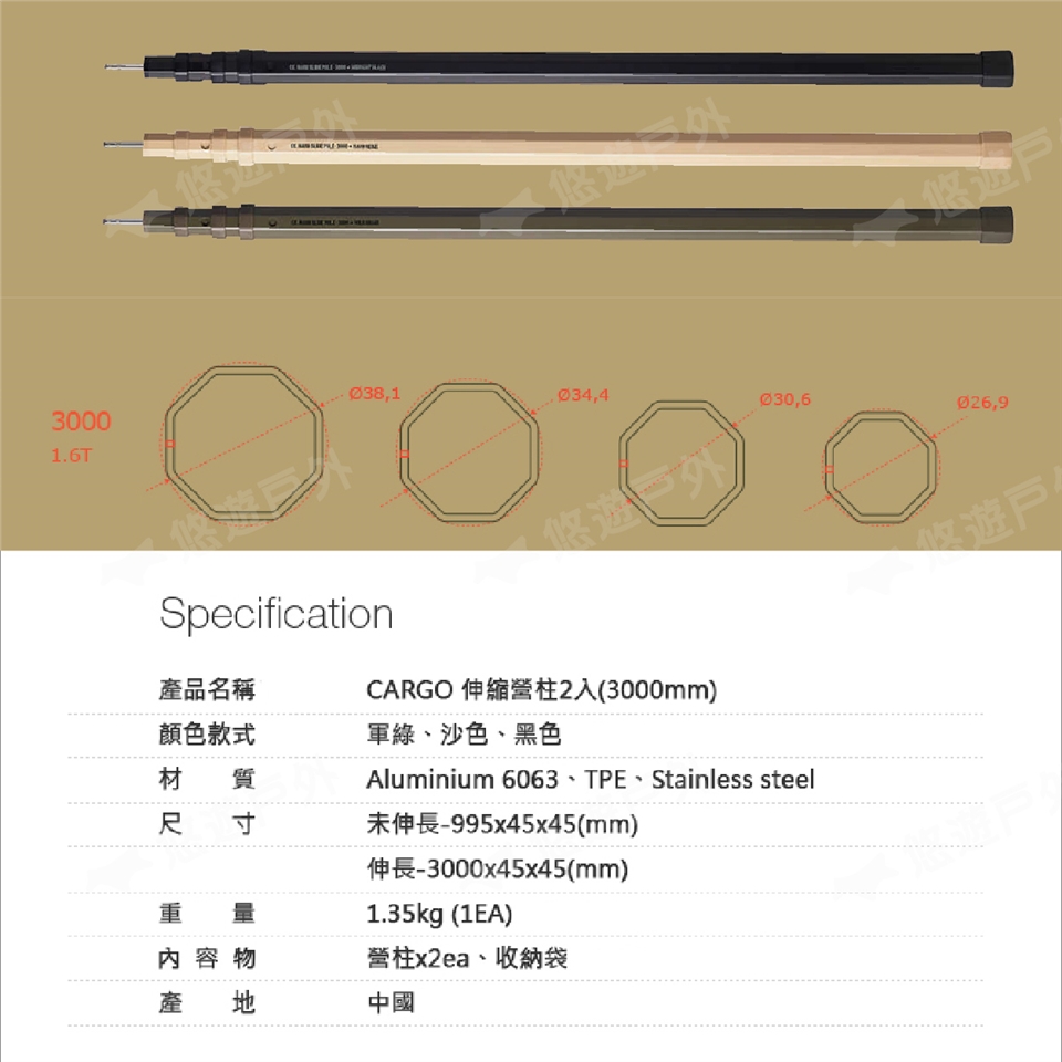 【悠遊戶外】CARGO 伸縮營柱2入 3000mm 三色