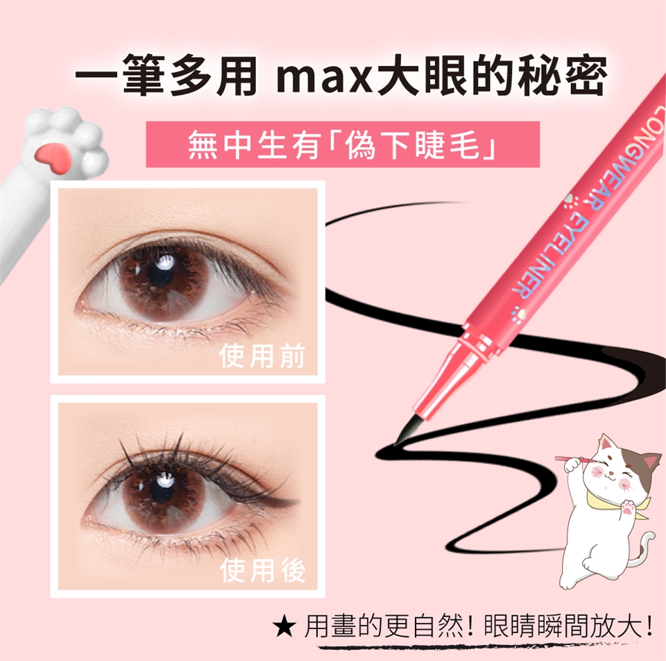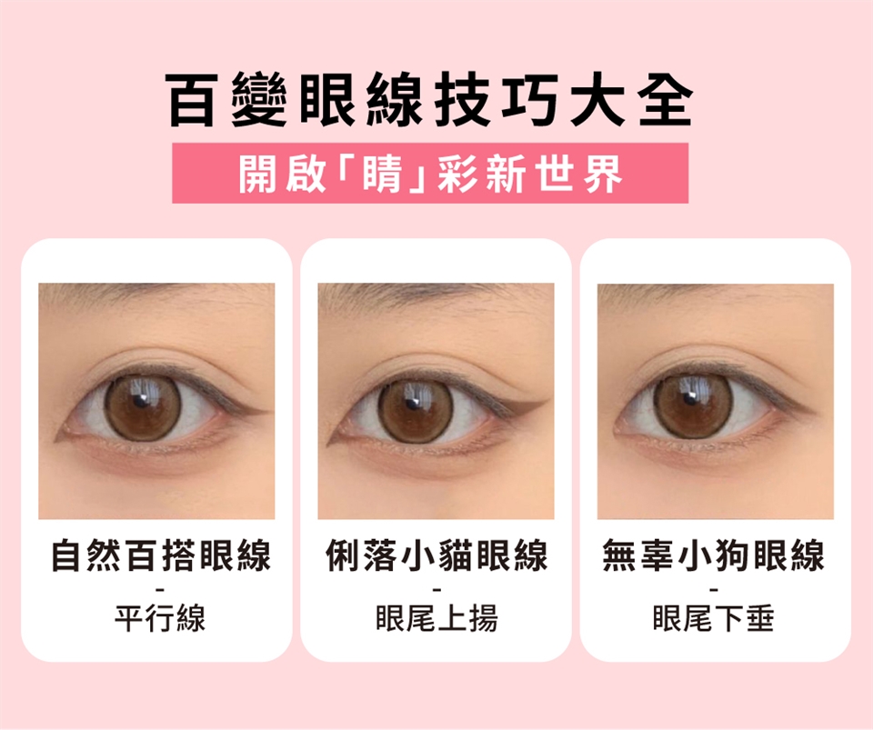 使用方法: 沿著眼際處,自眼頭至眼尾描繪出眼線,眼尾水平拉出長度,完成自然大眼💓