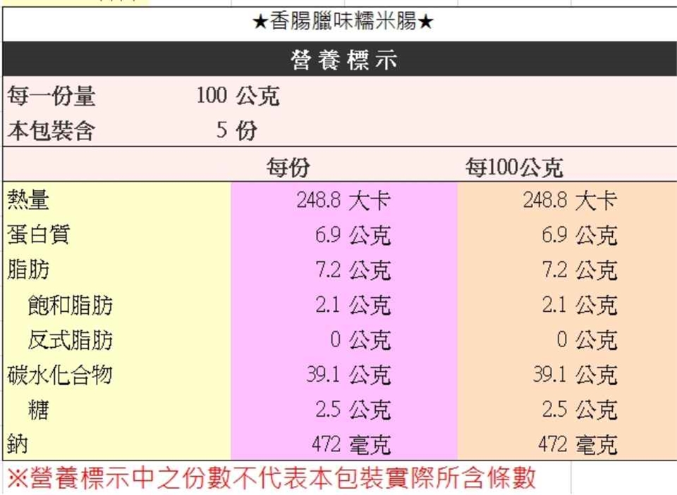 內容物:糯米、水、原味香腸【豬肉、豬背脂、糖、豬腸衣(法國)、調味劑(L-麩酸鈉)、食鹽、調味劑(乳酸鈉(溶液))、複方保色劑[食鹽、保色劑(亞硝酸鈉、硝酸鉀)、麥芽糊精]、甘草水(水、甘草)、結著劑(焦磷酸鈉、多磷酸鈉)、複方品質改良劑[調味劑(胺基乙酸)、醋酸鈉(無水)、酵素製劑(溶菌酶)]、抗氧化劑(L-抗壞血酸鈉)、甜味劑(甘草素、甘草萃)、調味劑(DL-胺基丙酸)】、醬油(水、非基因改造大豆(高蛋白豆片)、小麥、食鹽、酒精)、豬腸衣(法國)、豬油、香油(大豆沙拉油、芝麻油)、糖、紅蔥乾、原味臘腸【豬肉、豬背脂、糖、可食性牛膠原蛋白腸衣、高粱酒(高粱、小麥)、調味劑(L-麩酸鈉)、味醂(水、蔗糖、酒精、食鹽、糯米)、食鹽、調味劑(乳酸鈉(溶液))、複方保色劑[食鹽、保色劑(亞硝酸鈉、硝酸鉀)、麥芽糊精]、甘草水(水、甘草)、結著劑(焦磷酸鈉、多磷酸鈉)、複方品質改良劑[調味劑(胺基乙酸)、醋酸鈉(無水)、酵素製劑(溶菌酶)]、抗氧化劑(L-抗壞血酸鈉)、甜味劑(甘草素、甘草萃)、調味劑(DL-胺基丙酸)】、油蔥酥(紅蔥頭、豬油、麵粉)、調味劑(L-麩酸鈉)、雞肉調味粉(雞肉、麥芽糊精、鹽、L-麩酸鈉、糖、胺基乙酸、DL-胺基丙酸、5’-次黃嘌呤核苷磷酸二鈉、5’-鳥嘌呤核苷磷酸二鈉、雞油、香料、二氧化矽)、魷魚、香菇、蝦米、香菇精粉(香菇、食鹽、麥芽糊精、5’-鳥嘌呤核苷磷酸二鈉、5’-次黃嘌呤核苷磷)、乾燥醋粉、調味粉(麥芽糊精、食鹽、蔗糖、酵母抽出物、黃豆水解蛋白、香菇抽出物、高麗菜抽出物)、白胡椒粉(白胡椒、地瓜澱粉)、酵母抽出物、五香粉(肉桂、小茴香、甘草、花椒、八角)