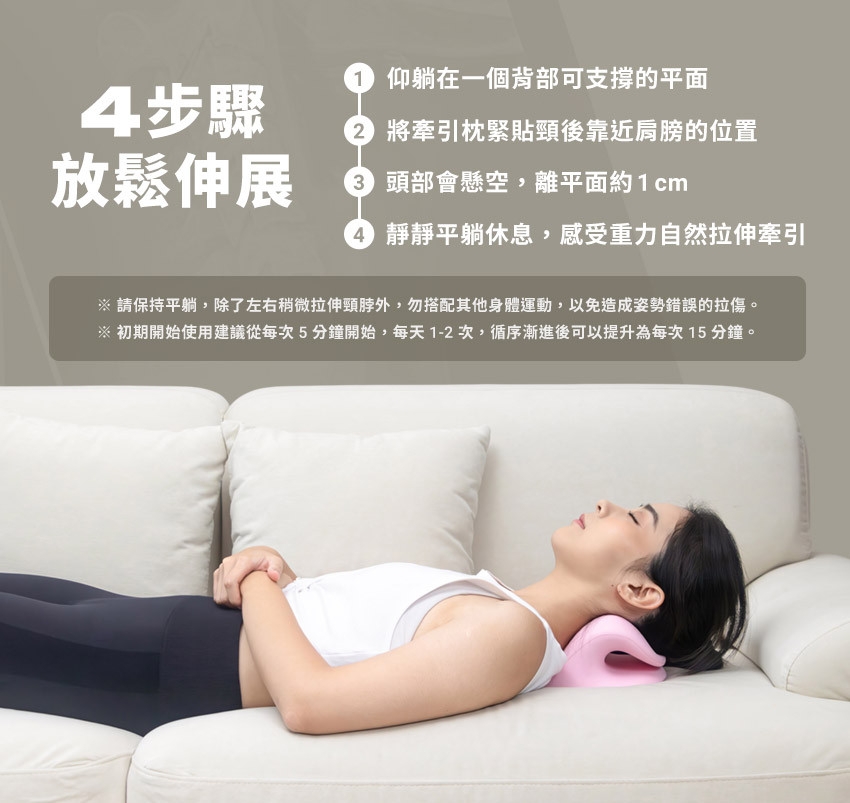 5. 為放鬆時短暫拉伸的頸枕,不建議作為睡覺的枕頭使用,以免翻身時拉傷。