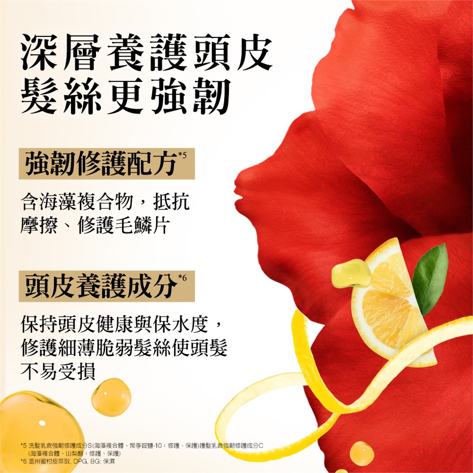 配合洗護兩大強韌修護配方,深層滋養、強化鞏固髮芯結構,有助減少33%摩擦受損,並使髮絲毛鱗片重現平滑
