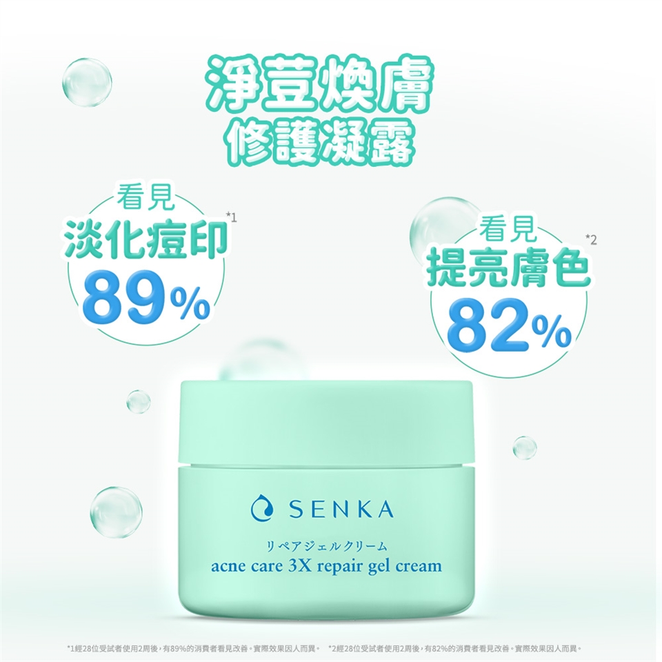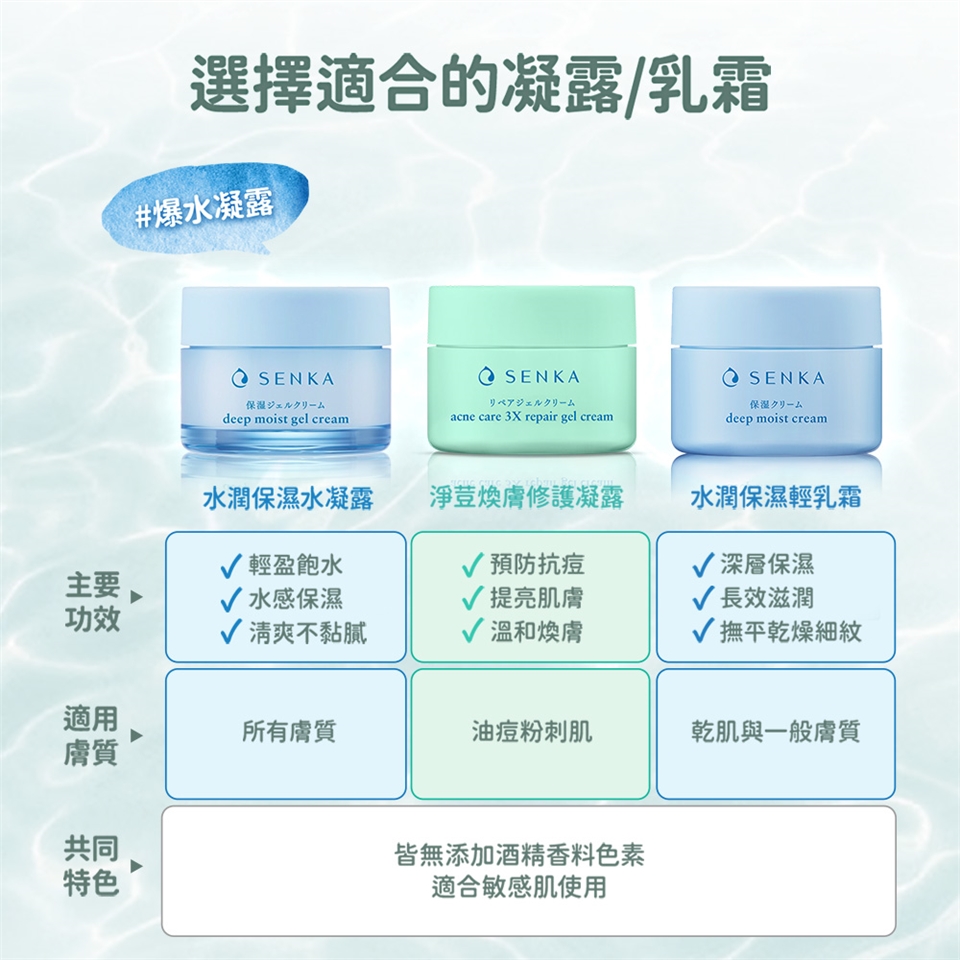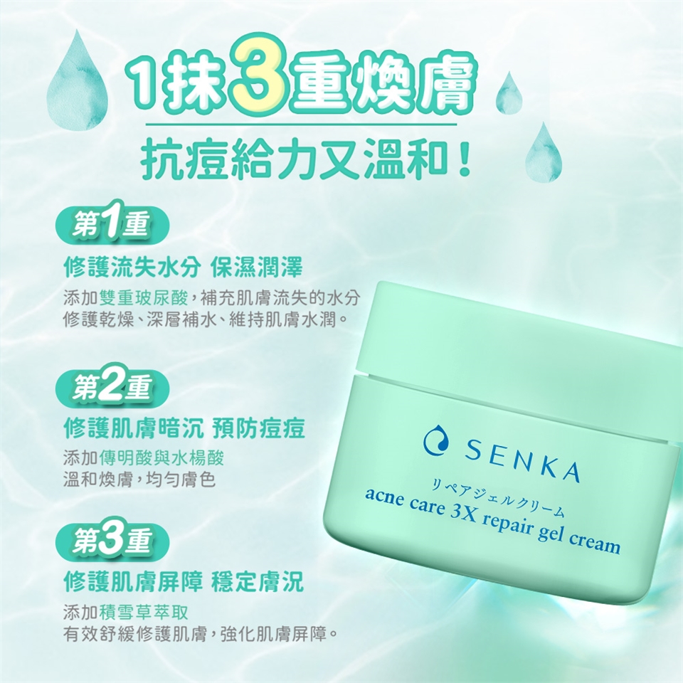 輕盈水感的凝露質地,能温和改善肌膚状況,透過獨特修護配方及舒緩成分,有效保清潤澤、預防痘痘及肌膚暗沉、強化肌膚屏障,達到三重煥膚效果,給肌膚更強韌的經透水潤感。