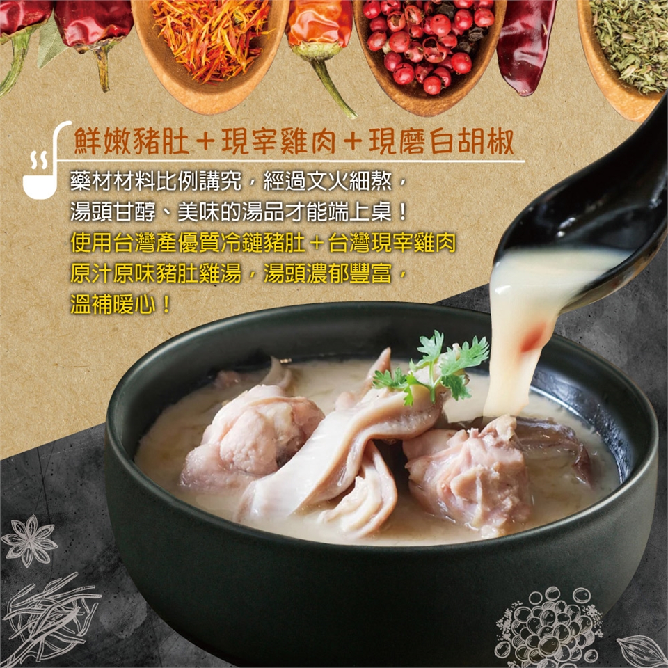 內容物成份 水、土雞肉(臺灣)、豬肚(臺灣)、老薑、蒜粒、米酒(米、精製食用酒精)、食鹽、雞肉粉(雞肉,迷迭香萃取物),香料,酵母萃取物(酵母萃取物,鹽),雞油(雞油,迷迭香萃取物),棕櫚油,調味劑(5'-次黃嘌呤核苷磷酸二鈉,5'-鳥嘌呤核苷磷酸二鈉)、白胡椒粒