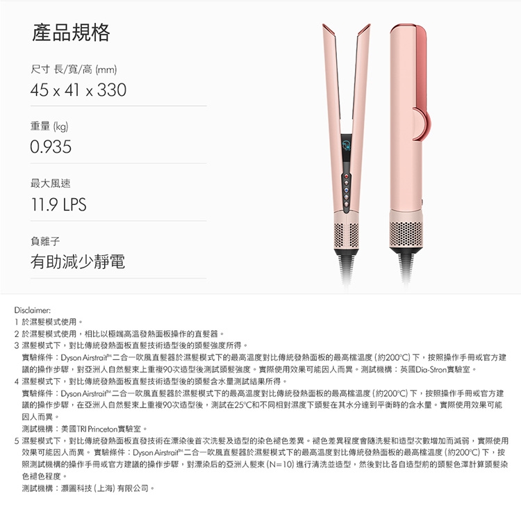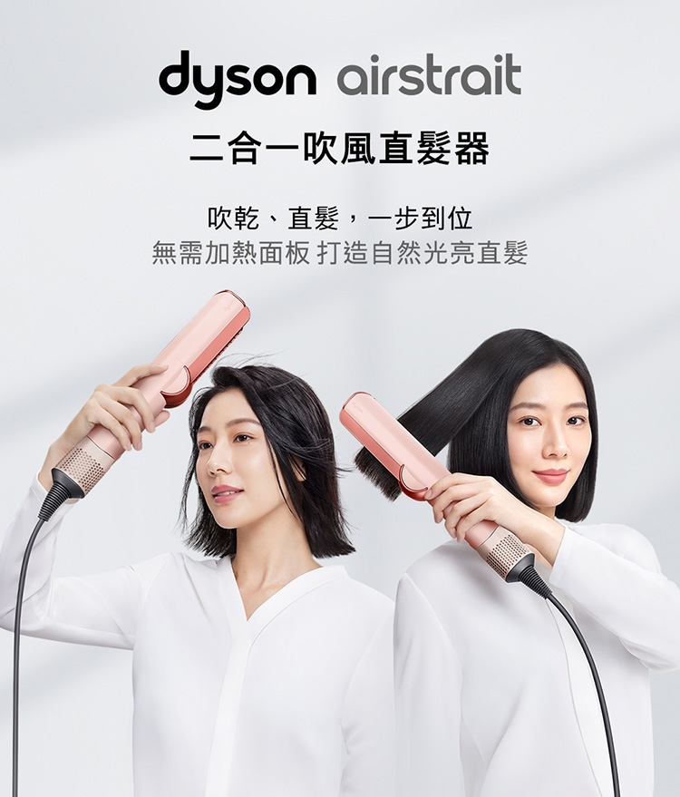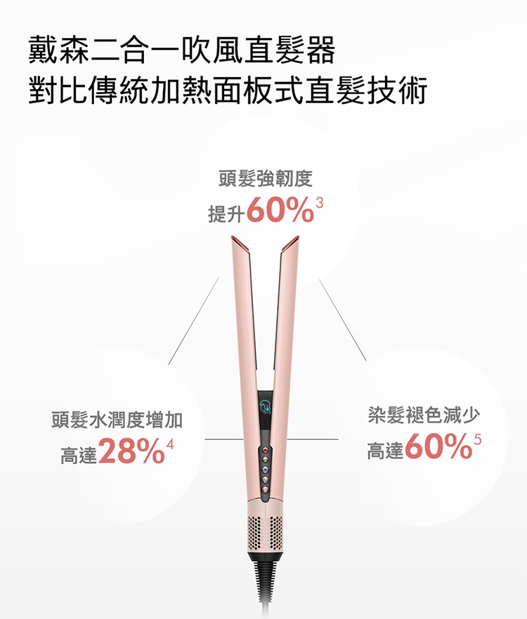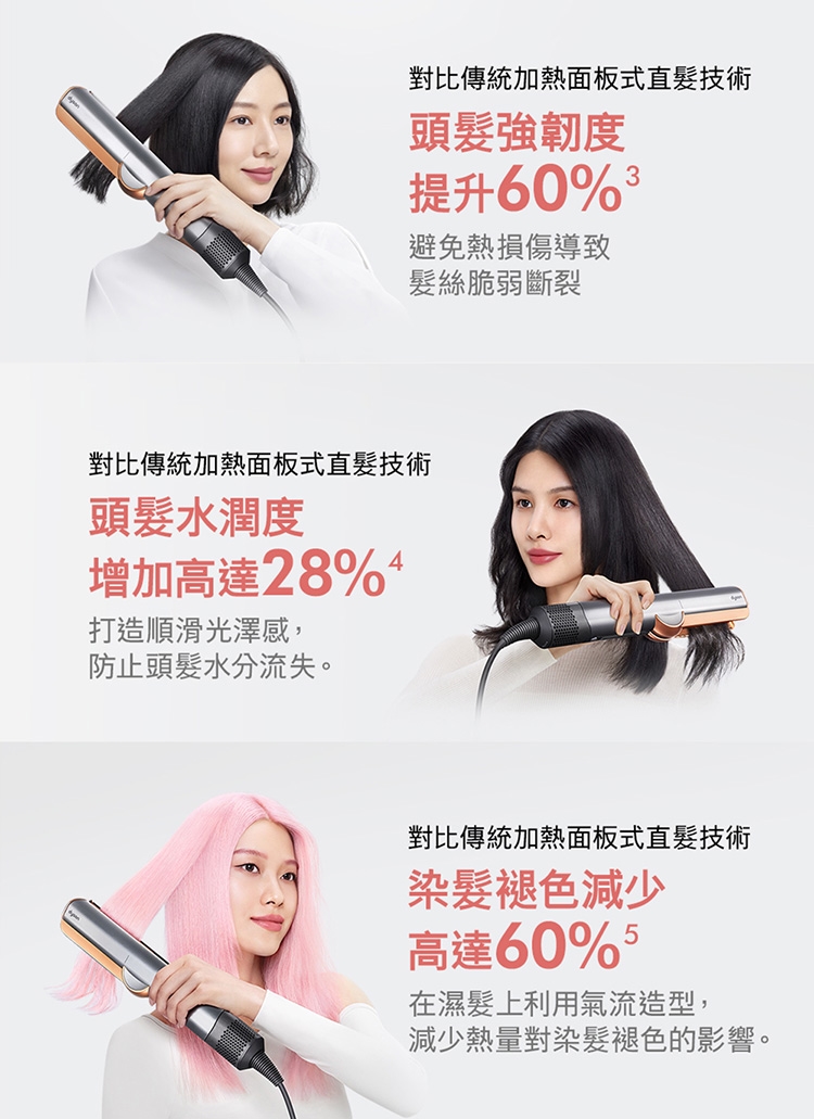 3. 乾濕兩用省時省心:不依賴加熱面板,無熱傷害: 傳統加熱式直髮器,利用高溫造型易造成頭髮斷裂乾枯。Dyson二合一吹風直髮器,提升髮絲強韌度60% / 水潤度28%/ 染髮退色60%