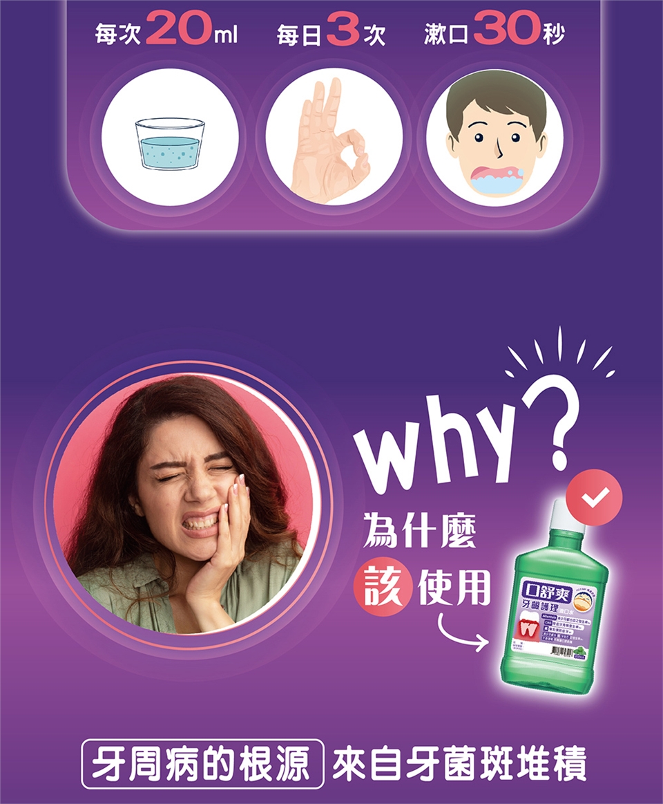 ‧每日2~3次,每次10~20ml,含於口內漱動30秒後吐掉。