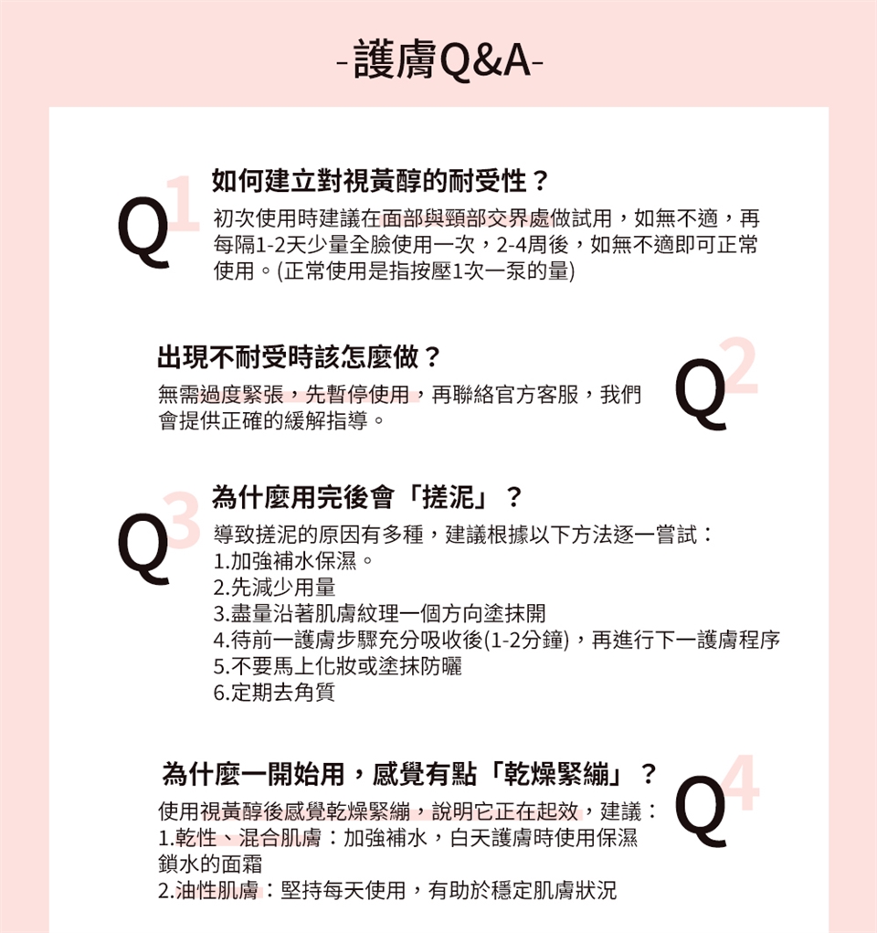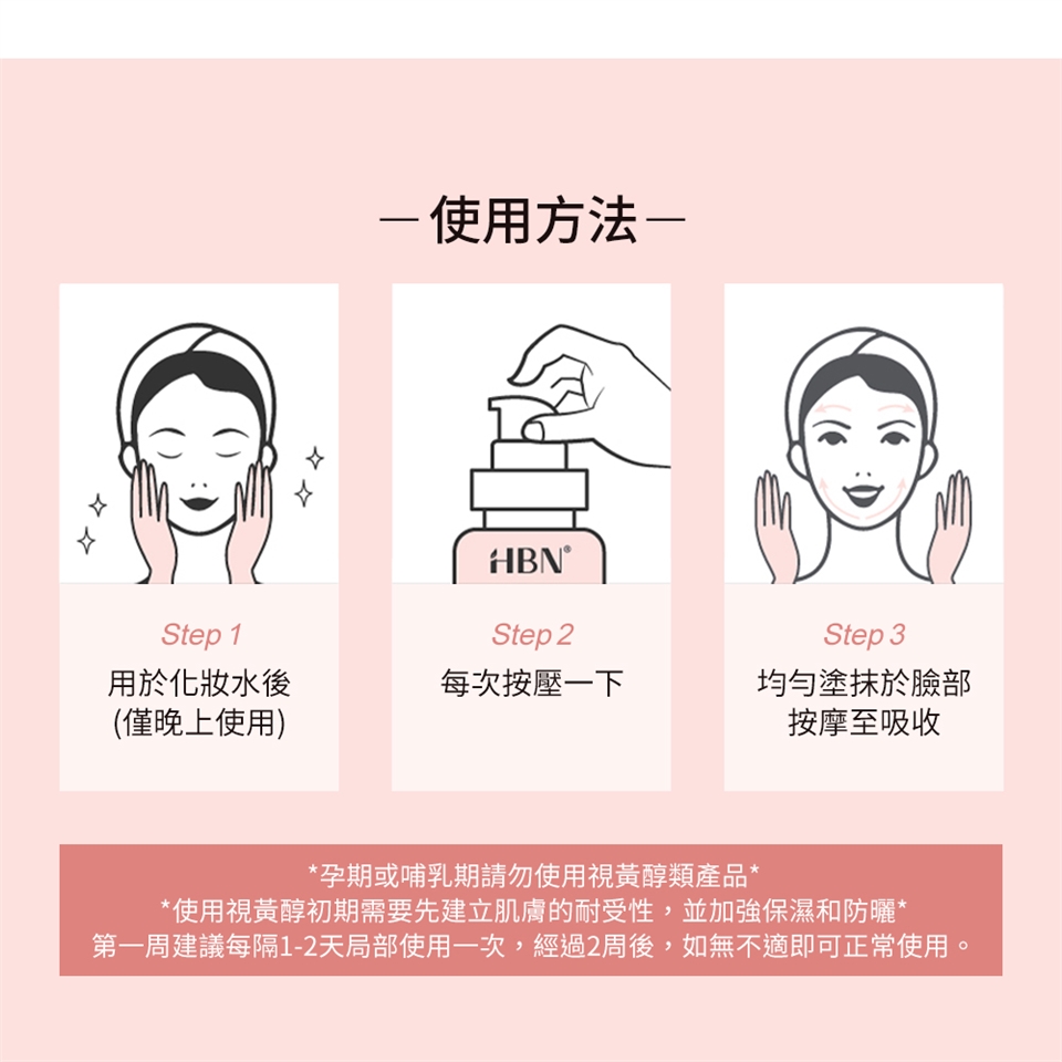 1. 孕期或哺乳期請勿使用視黃醇類產品。