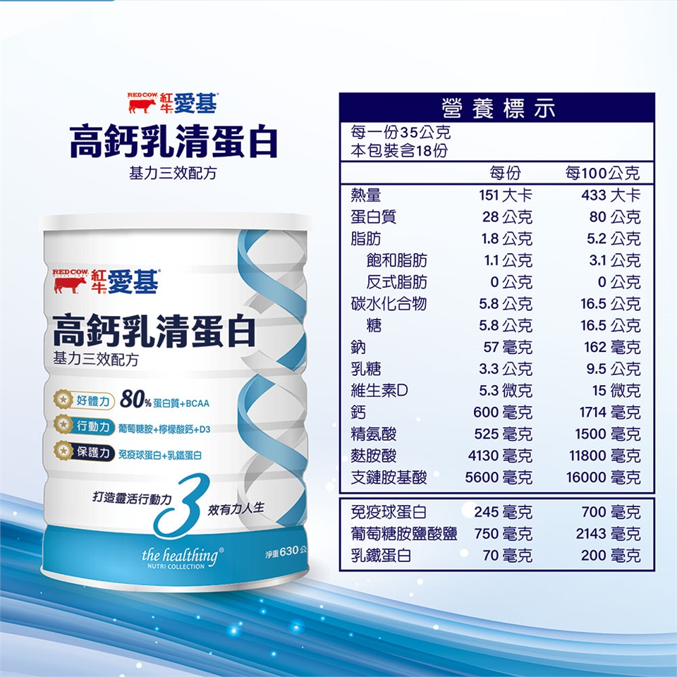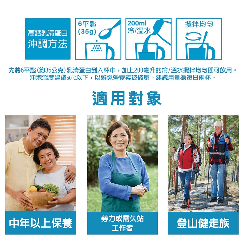 先將6平匙(約35公克)乳清蛋白倒入杯中,加入200毫升的冷/溫水攪拌均勻即可飲用。