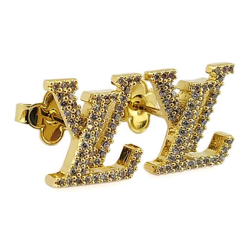LV 鑲水晶萊茵石LV字樣墜飾金色金屬耳環