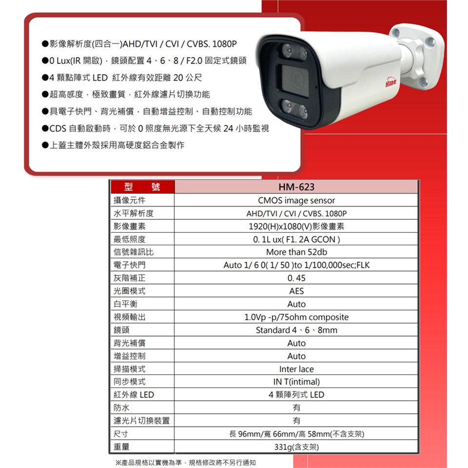 ●0 Lux(IR 開啟),鏡頭配置 4、6、8 / F2.0 固定式鏡頭