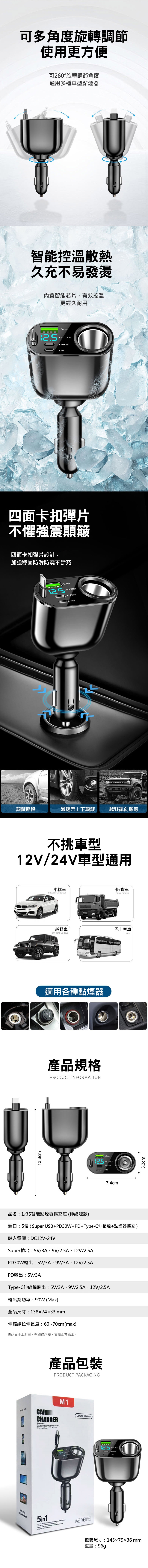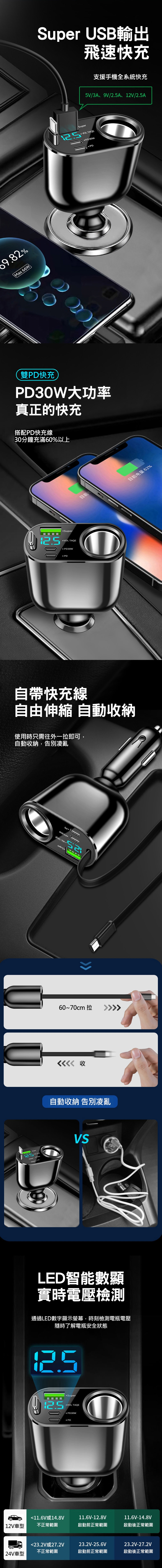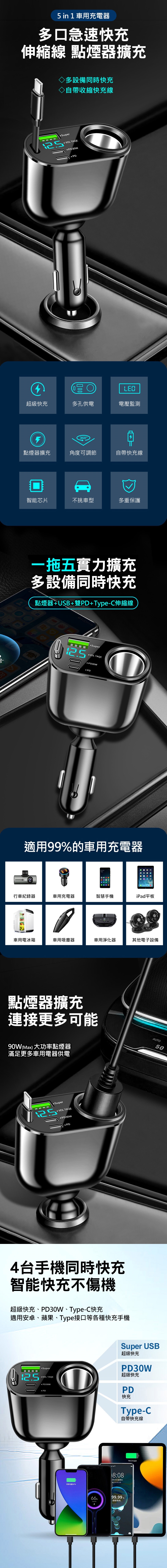 端口:5個 ( Super USB+PD30W+PD+Type-C伸縮線+點煙器擴充 )
