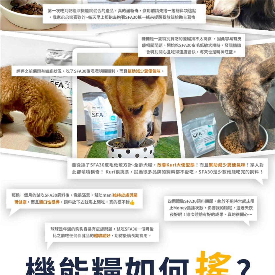 飼料袋上下搖晃約20秒(讓雙顆粒均勻)→倒出即可食用(可依據狗狗平時用量倒出)