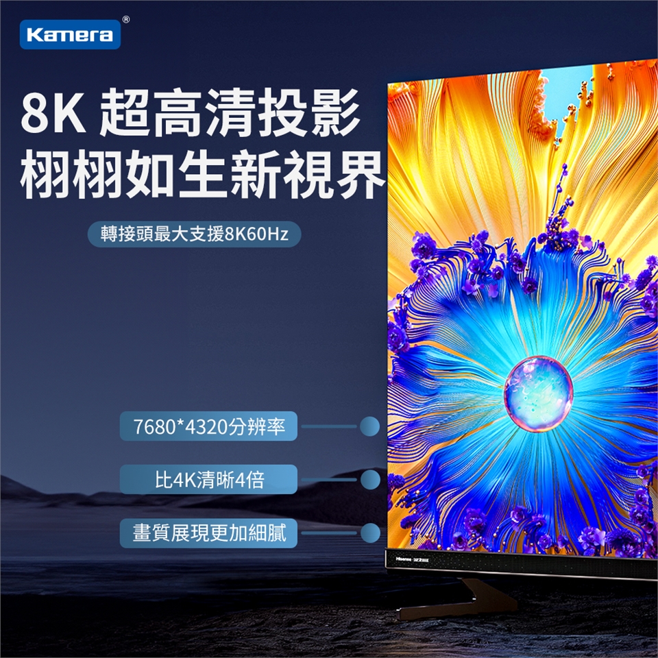 - 8K@60Hz影像傳輸:支援 8K 超高清解析度與高幀率顯示,確保流暢視覺體驗。