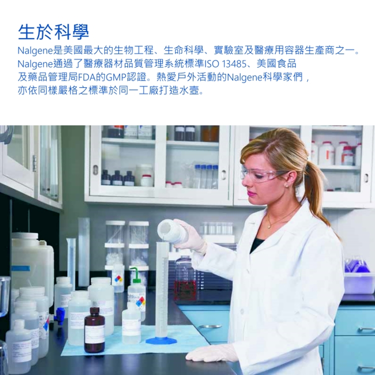 - 63mm的蓋子適合其他Nalgene寬嘴水壺瓶蓋相連設計,瓶蓋不易遺失,且容易旋開及旋緊。