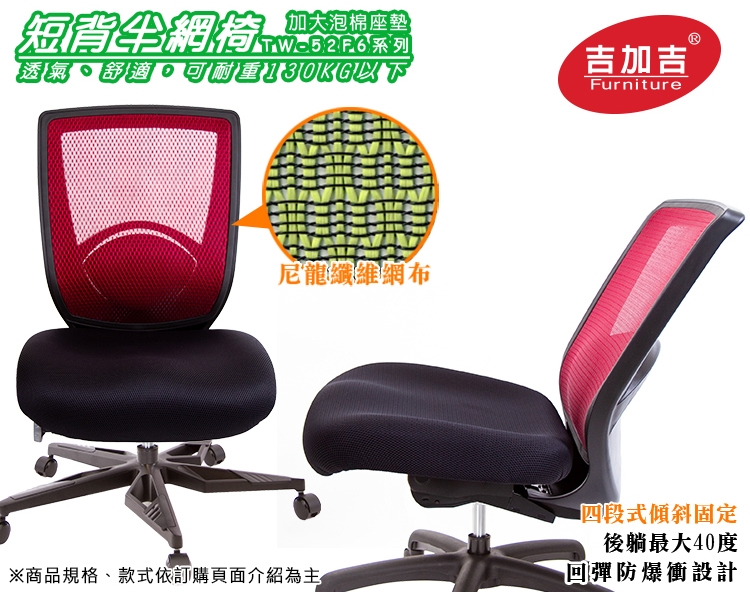 TW-52F6半網電腦椅,椅背採用台灣製造SGS認證特網,使用尼龍纖維絲,不吸水、好清潔;配上重量級大座墊,給你滿滿大平台的乘坐空間。