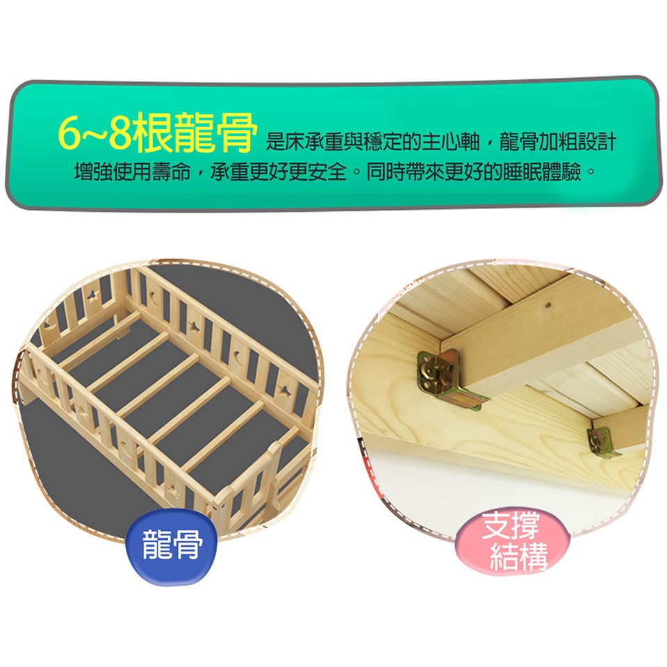 • 加大床板結構:5〜8 根大龍骨,強化支撐,安全無憂。