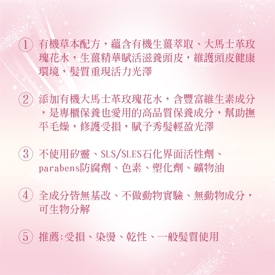 ★有機草本配方,添加有機生薑、玫瑰植萃,賦活滋養頭皮,維護頭皮健康環境,柔順零毛燥,秀髮活力光澤