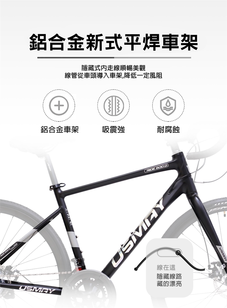 鋁合金車架,內走線設計,搭配了高拉力前叉粗曠管壁提升強度騎行,也能幫助操控性能的提升。