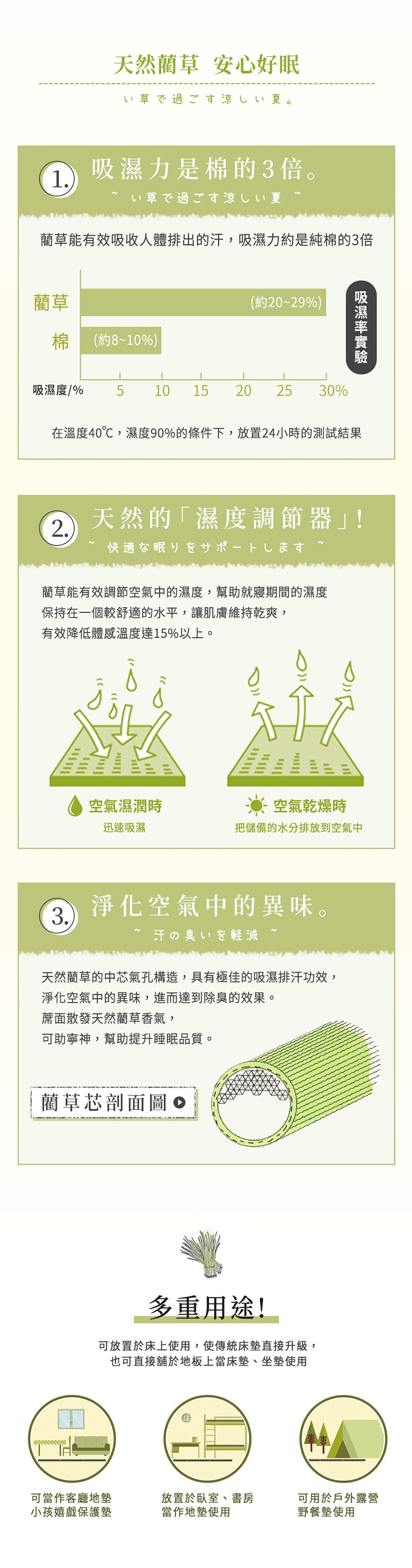 藺草中芯氣孔構造能吸附濕氣,有效淨化空氣中的異味,散發淡淡藺草香氣,可助寧神,幫助提升睡眠品質。