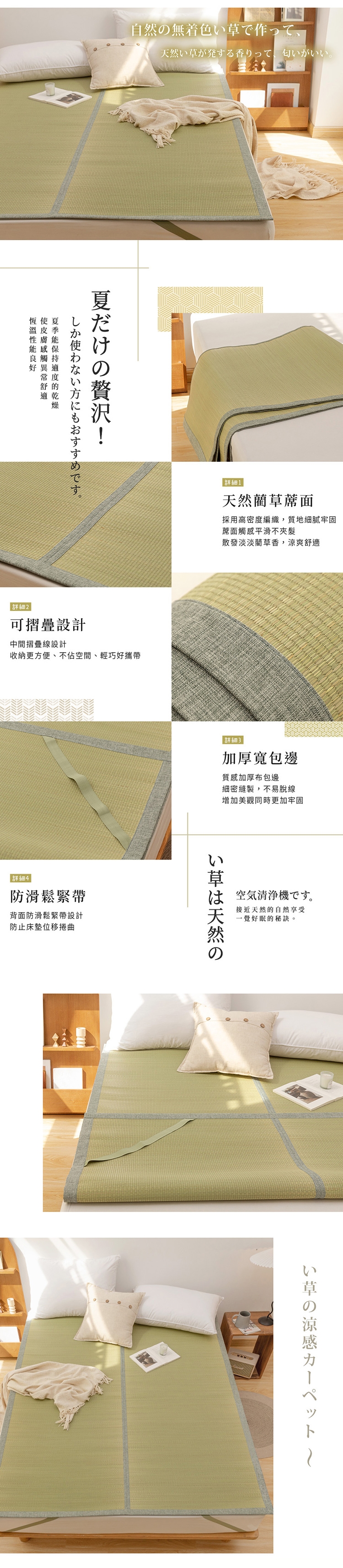 採用天然藺草精緻編制,透氣排汗、調解溫度、涼而不冰冷、觸感極佳,搭配淡淡藺草香氣,柔和舒適,實在超清爽~ 不設限的