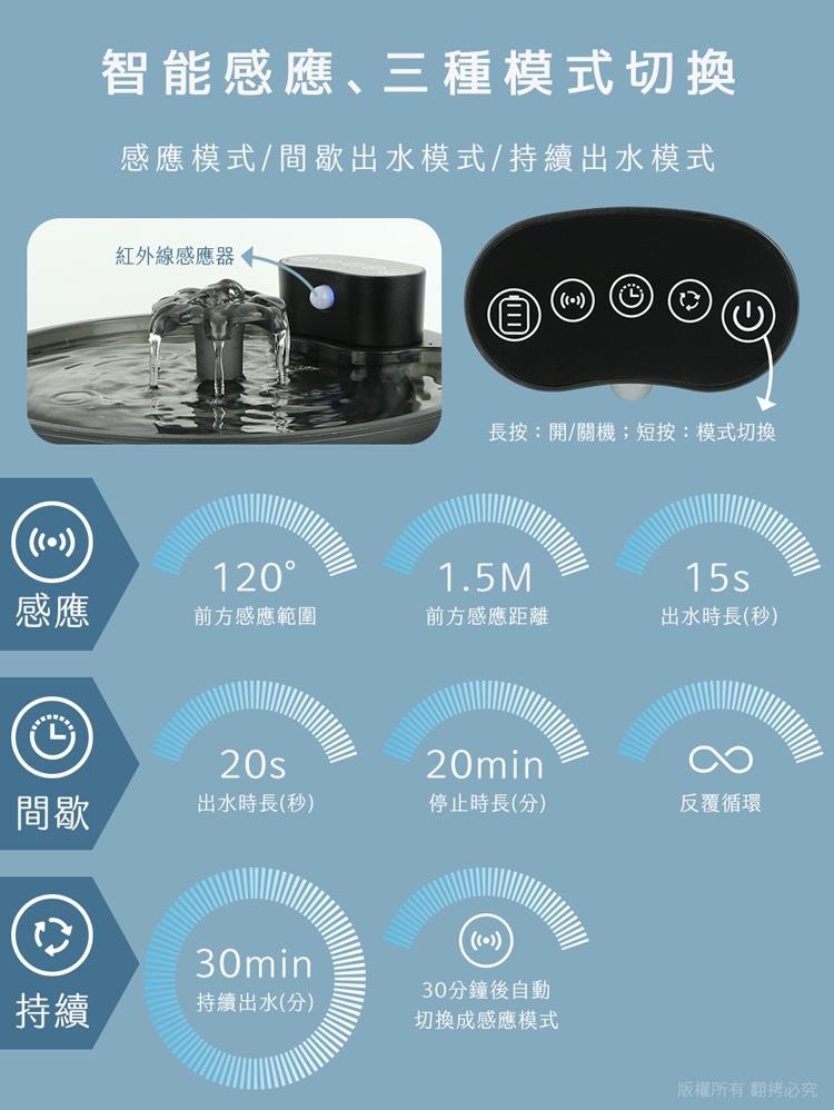 感應模式:120°廣角+1.5M距離,感應範圍內有毛孩靠近,感應燈亮藍燈,持續出水15秒後停止,直至再次感應。