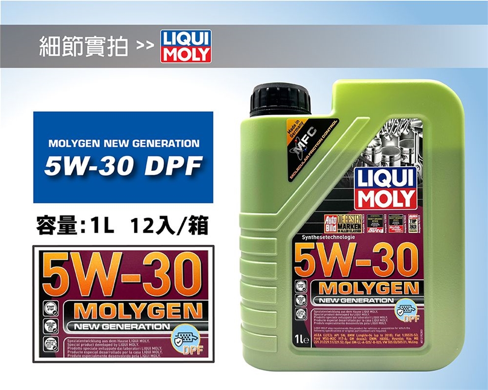Liqui Moly Molygen New Generation 5W-30 DPF 是一款基於合成技術的低摩擦機油,採用了創新的MFC耐磨保護技術,提供極高的動力儲備以實現最大性能。其優異的清潔能力和懸浮污垢的功能可確保引擎的最佳清潔,從而節省燃料並確保可靠運行,延長柴油顆粒過濾器(DPF)和引擎的使用壽命。此產品超過了知名車輛製造商的測試要求。
