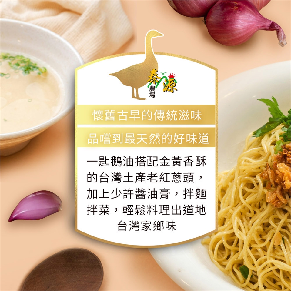 商品詳細介紹 體驗說明 不可體驗 使用方法說明 依包裝所示 注意事項 鵝油香蔥,於常溫下油脂會呈現澄清狀、半固狀、油脂分離或部分米粒狀;紅蔥中的碳水化合物經油炸後會產生少量局部黑褐色,皆為天然傳統製作工序的正常現象,風味不變,品質保證,敬請安心食用。