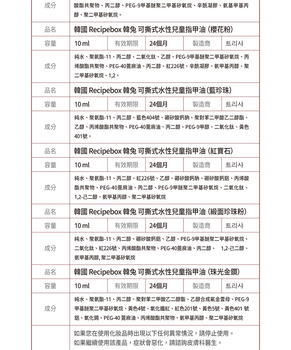 本產品為外用商品,如使用後出現不適時,請停止使用,並尋求專業醫師。若不慎進入眼睛,請立即以清水清洗。請避免兒童誤食。