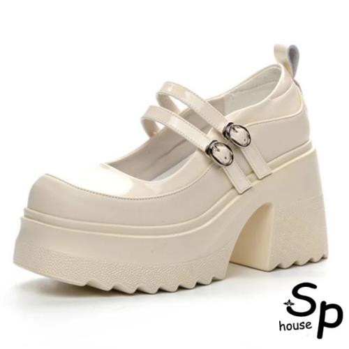 Sp house 雙排一字方頭瑪麗珍真皮超高跟厚底粗跟鞋(2色可選)