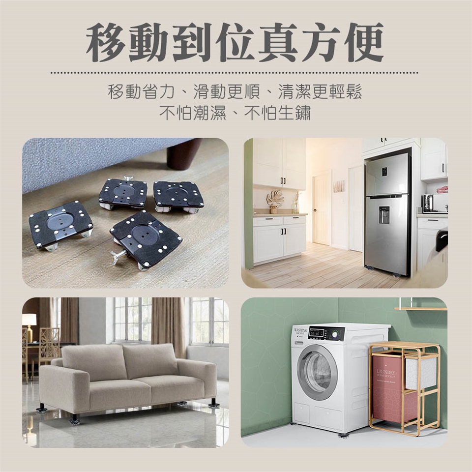 移動方式:本產品適用於平坦地板,請緩慢推動家具至目的地,避免因地面高低差或磁磚縫隙導致底座位移。