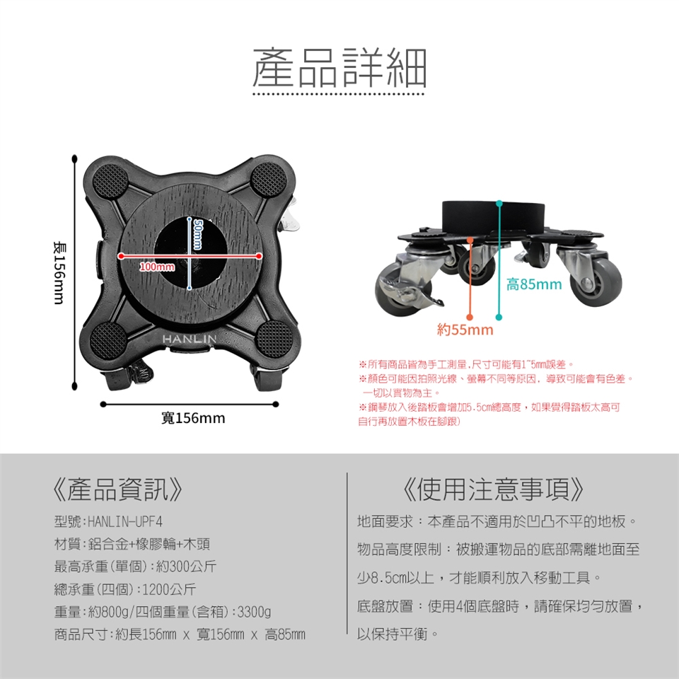 - 超高承重:單組底座可承重高達300公斤,適用於鋼琴、家具等重物。