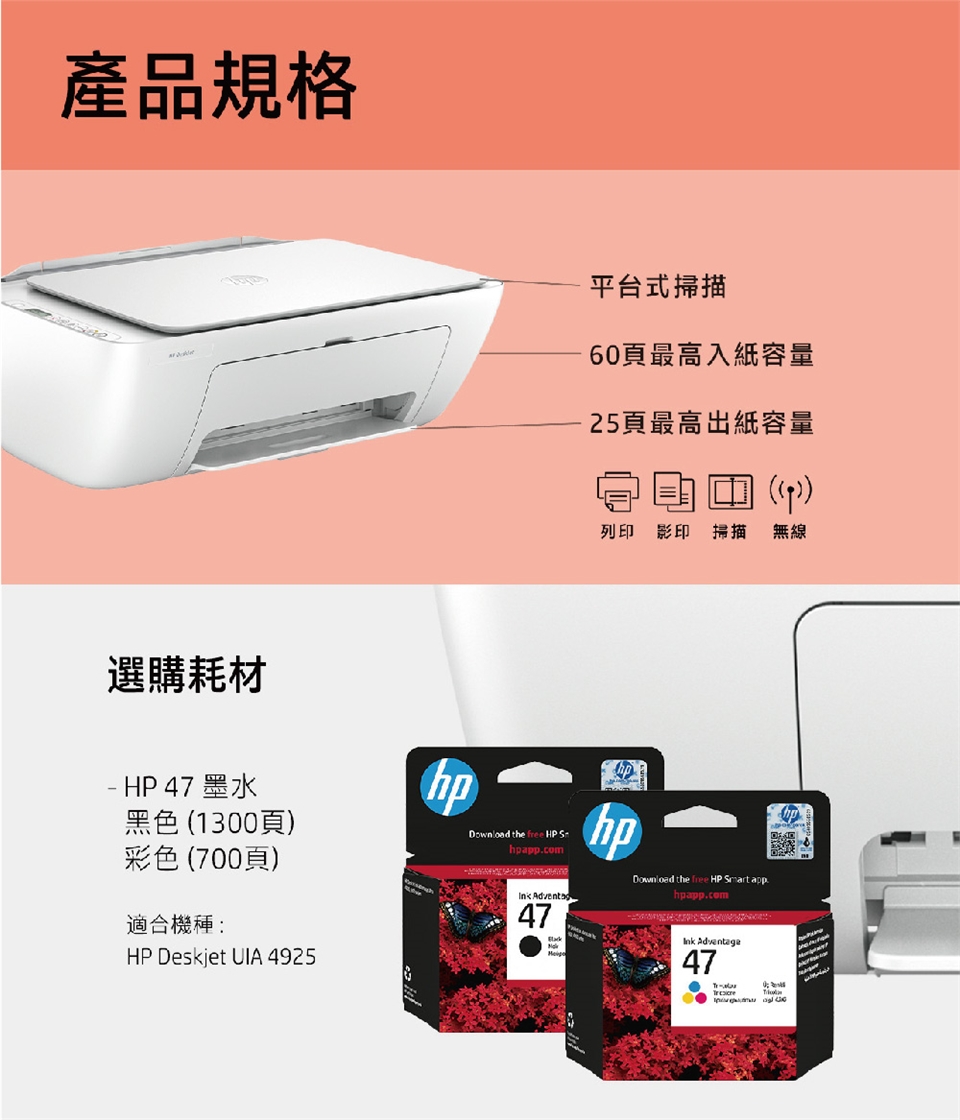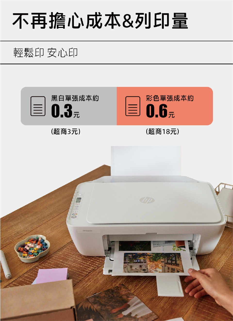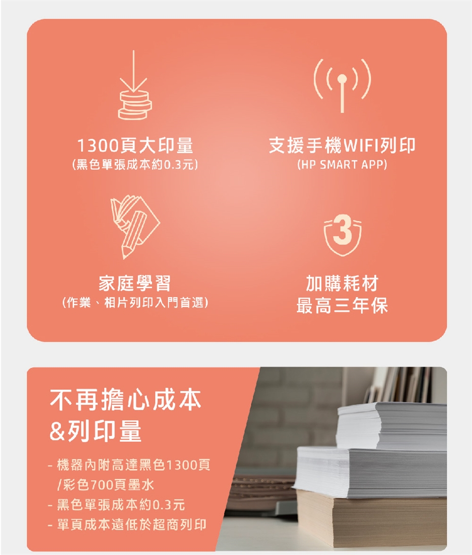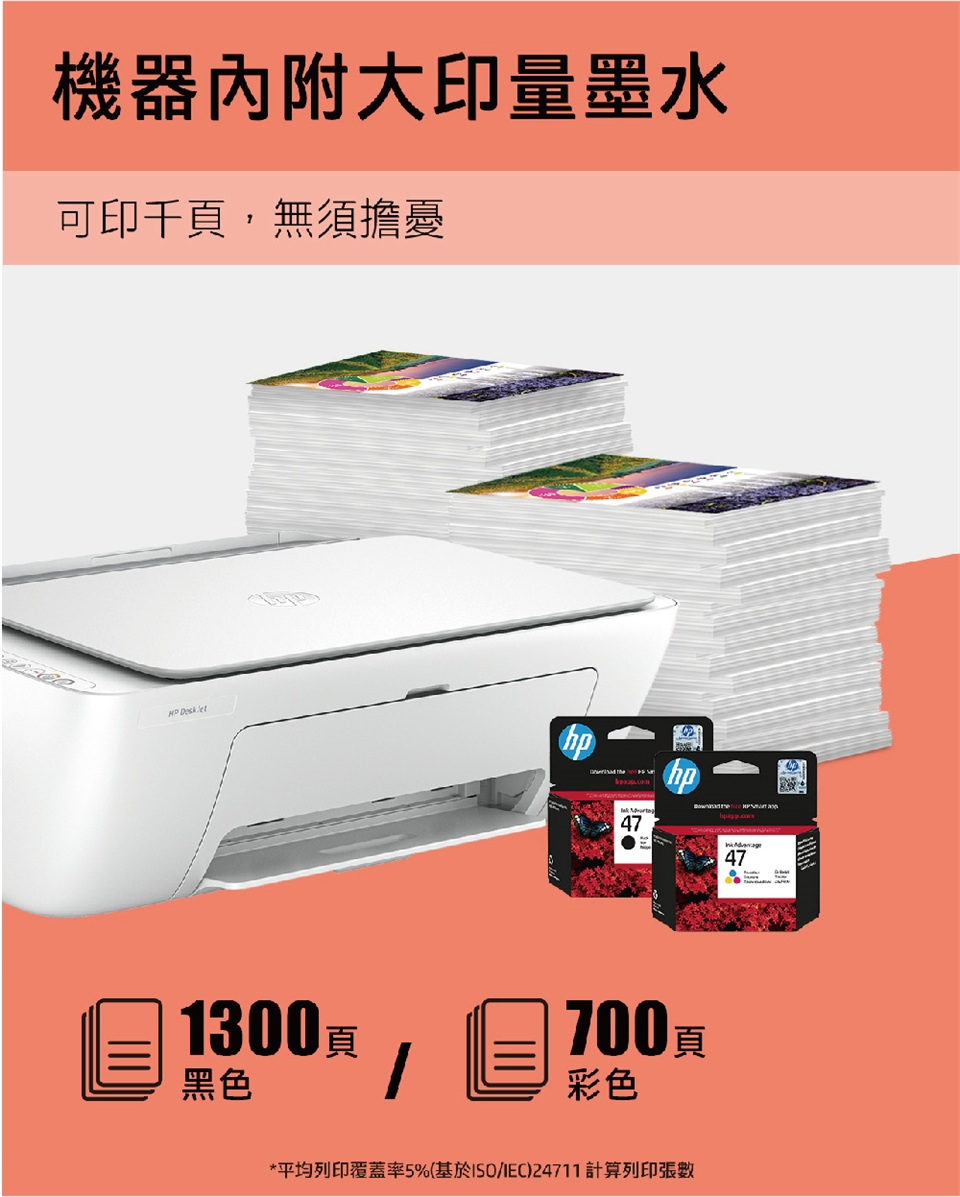 - 內附大印量墨水: 高達黑色1300頁/彩色700頁墨水