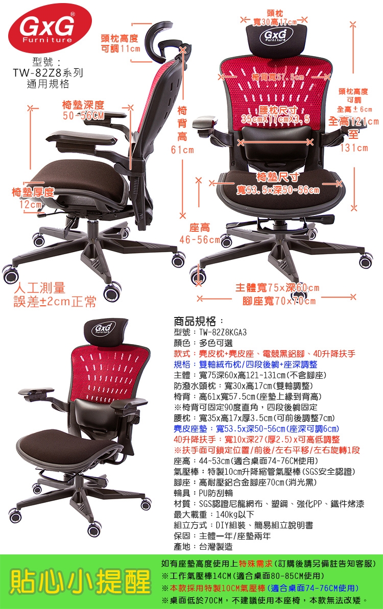 購買注意事項:本座椅高度,均以搭配標準桌高74~76CM使用。