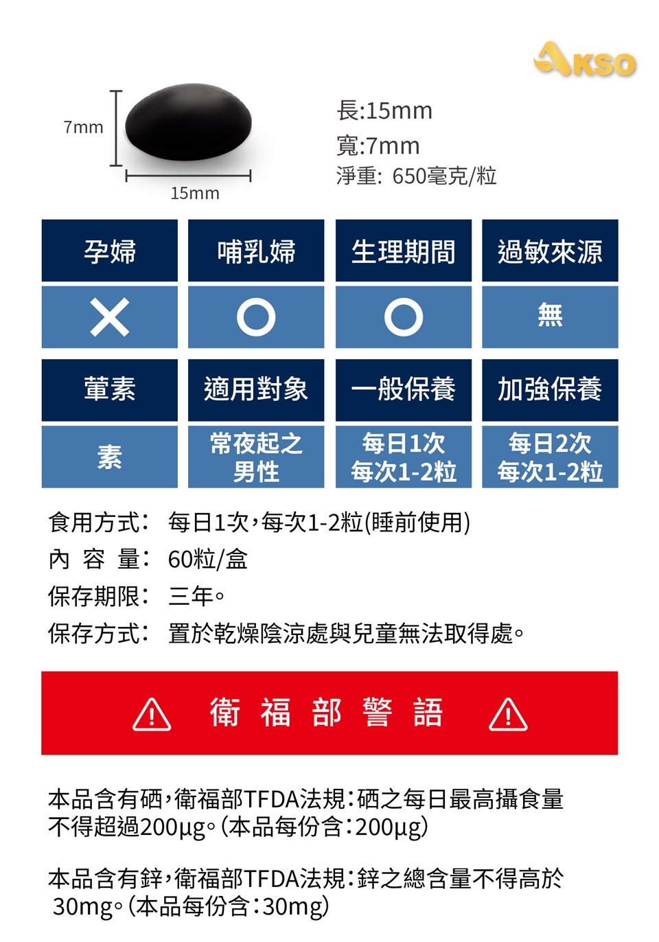 1. 孕哺乳婦不建議食用。 2. 本品為一般食品,非藥品,因個人體質不同,使用後如有任何不適,請立即停用並諮詢醫師、藥師或營養師 3.衛福部TFDA法規:硒之每日最高攝食量不得超過200微克,鋅之總含量不得高於30毫克