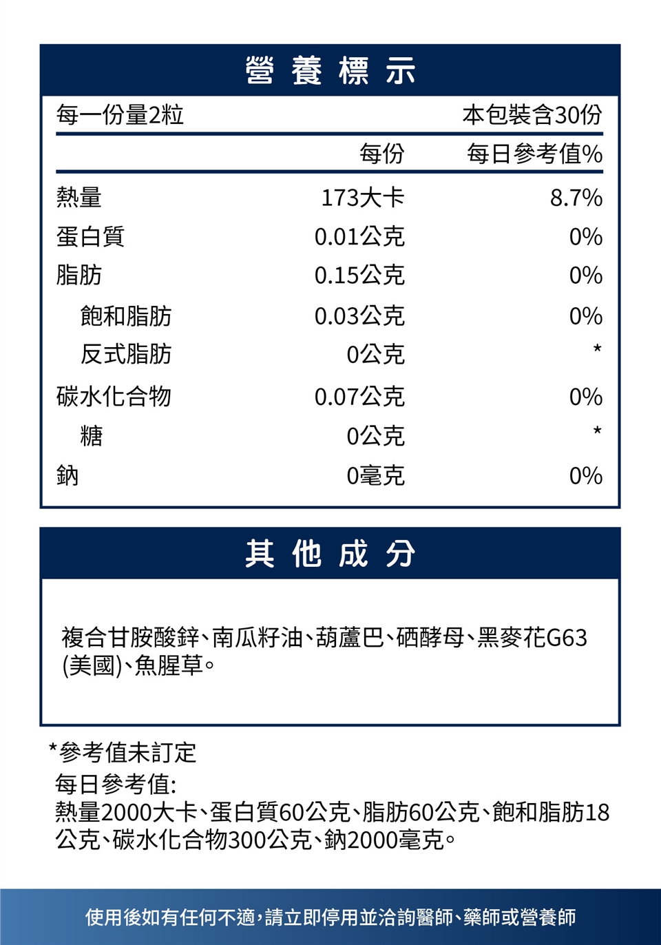 1. 孕哺乳婦不建議食用。 2. 本品為一般食品,非藥品,因個人體質不同,使用後如有任何不適,請立即停用並諮詢醫師、藥師或營養師 3.衛福部TFDA法規:硒之每日最高攝食量不得超過200微克,鋅之總含量不得高於30毫克