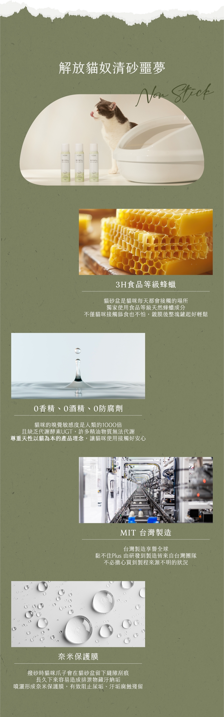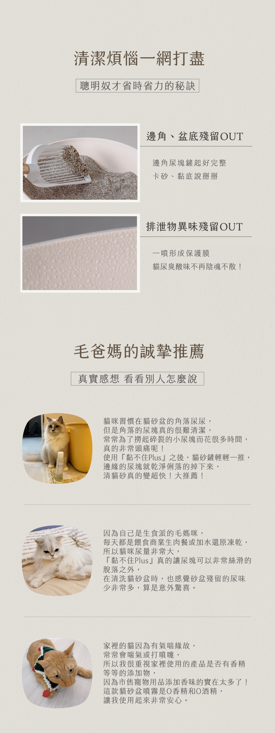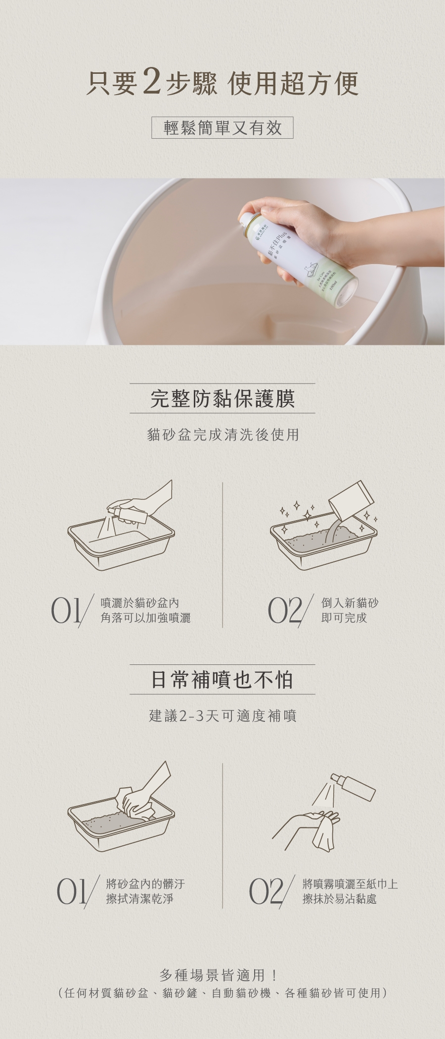 商品詳細介紹 體驗說明 不可體驗 使用方法說明 1.將貓砂盆清洗後擦乾2.噴灑於貓砂盆內,角落可以加強噴灑3.靜置10~20秒後倒入新貓砂即完成 注意事項 請將產品存放於陰涼乾燥處並遠離火源,避免陽光直射。