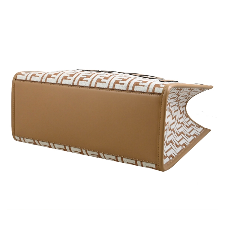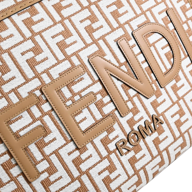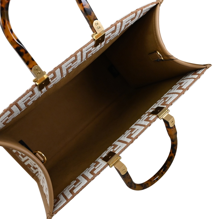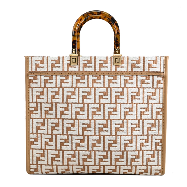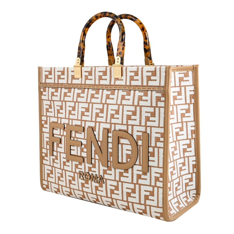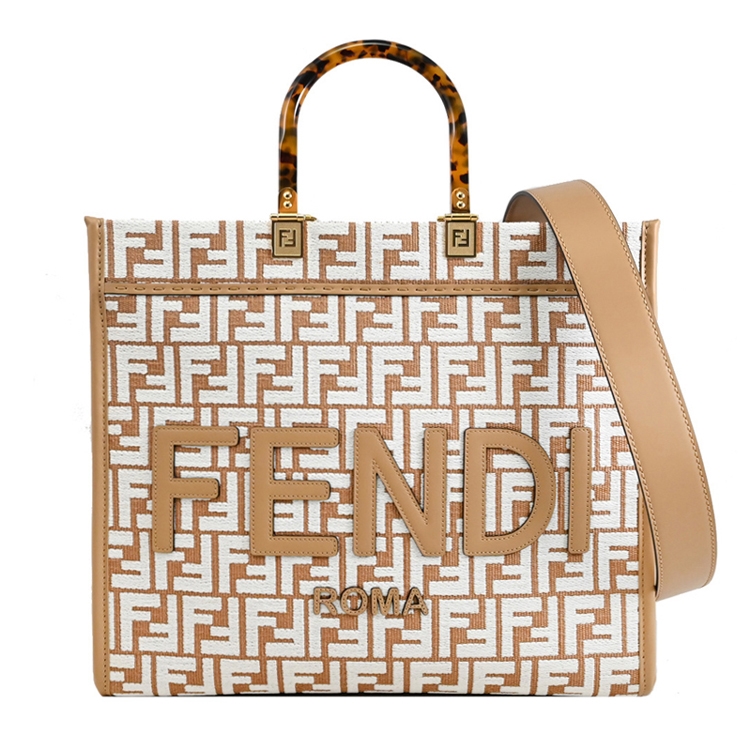 FENDI 品牌己延續歷史的精髓,F LOGO設計不止是顯現完美的奢華、沉穩、熟女專用的精品,除了保有傳統奢華形象,現在的FENDI 多了更多的變化的策略,深入觀察FENDI的世界,便能慢慢體會它的精品美學趣味;此款式FENDI經典Sunshine系列中號托特包,質感樹脂提把搭配緹花帆布材質,內可放A4文件、15吋筆電、摺疊傘等隨身物品,肩背帶可拆,無論自用或是送禮,都是最佳首選。