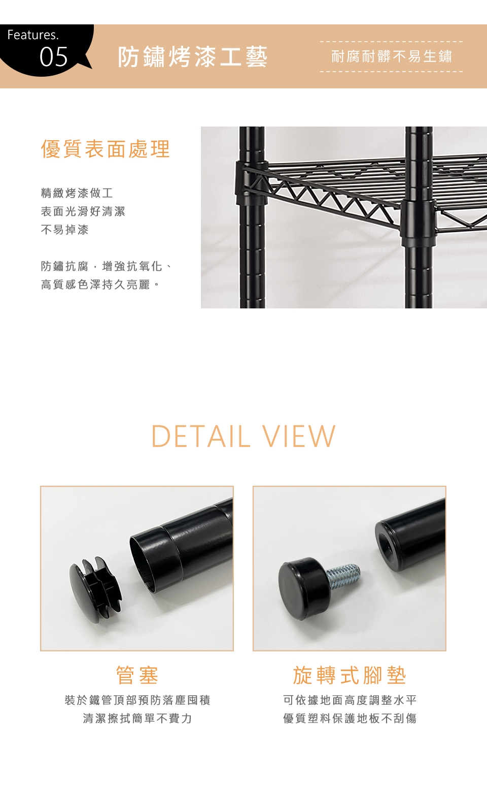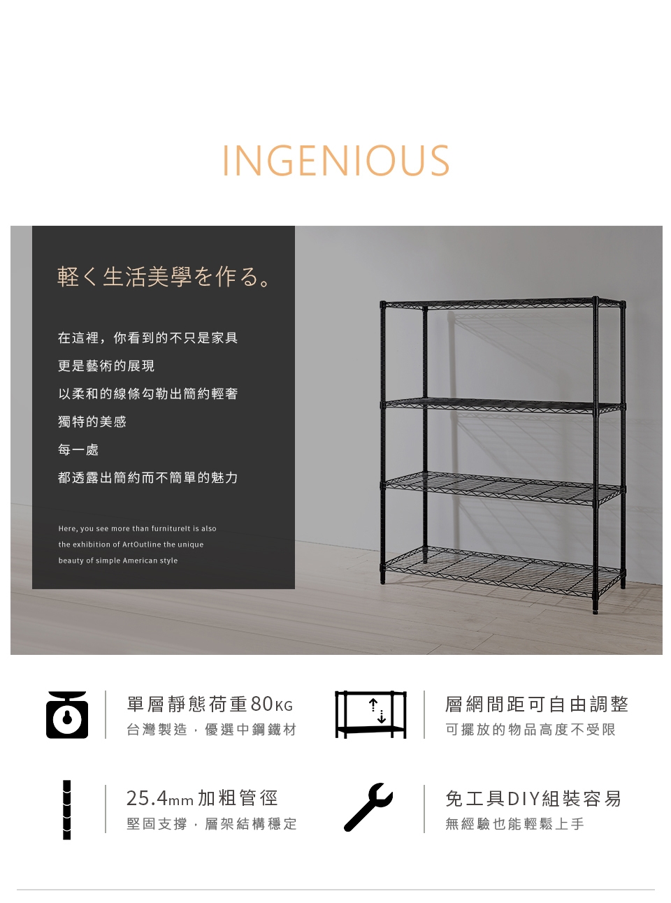 質感鐵力士層架,嚴選MIT中鋼鐵材,表面精緻烤漆做工,呈現高質感色澤、持久亮麗,防鏽抗腐蝕、承重力強,堅固耐用!