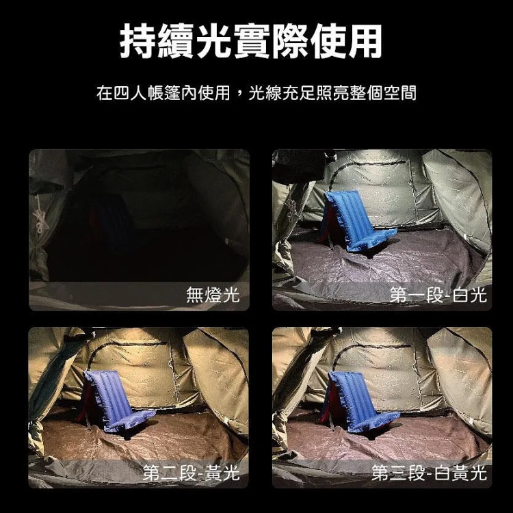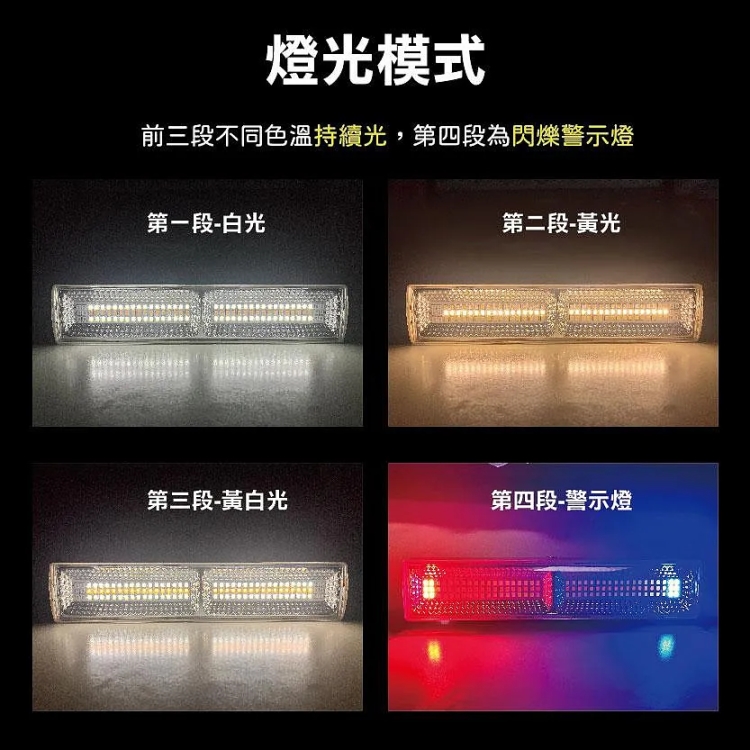 - 四檔燈光模式:包括三檔不同色溫的持續光模式,滿足不同環境需求,以及一檔警示燈,提升安全性。