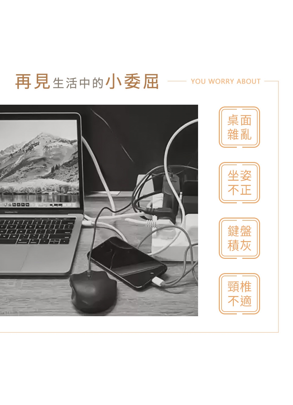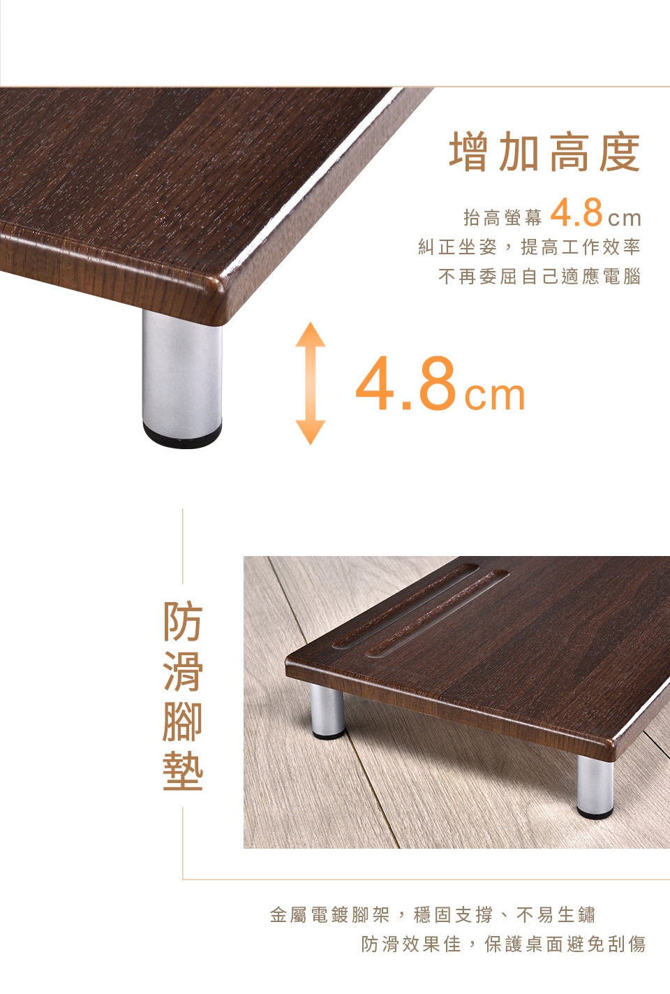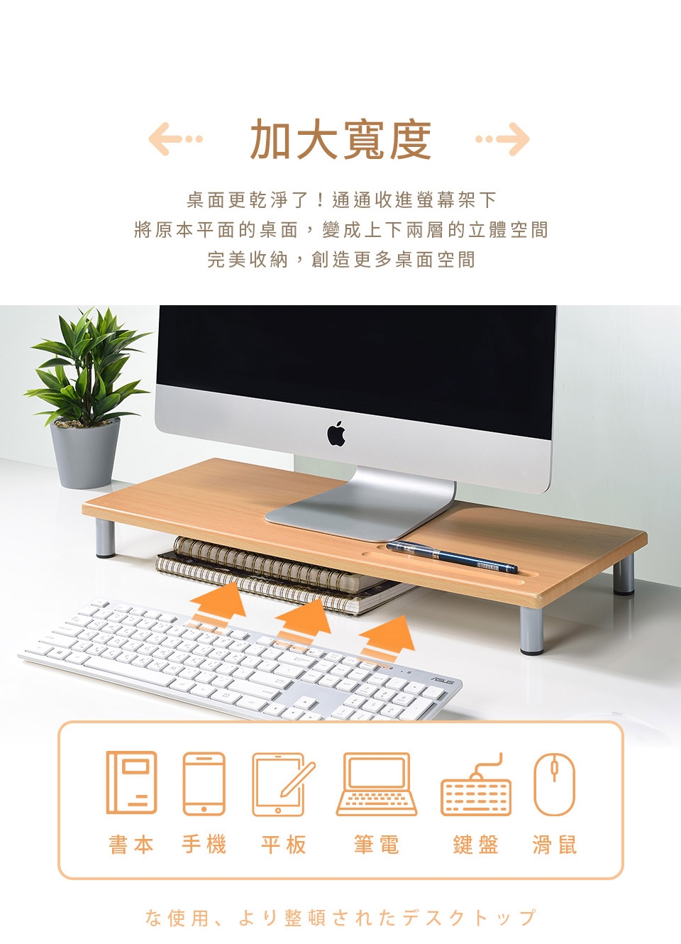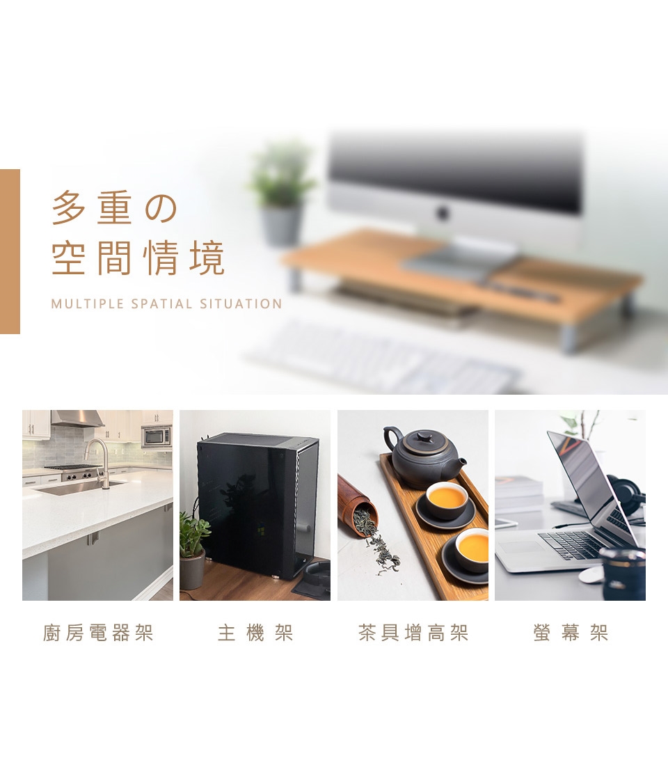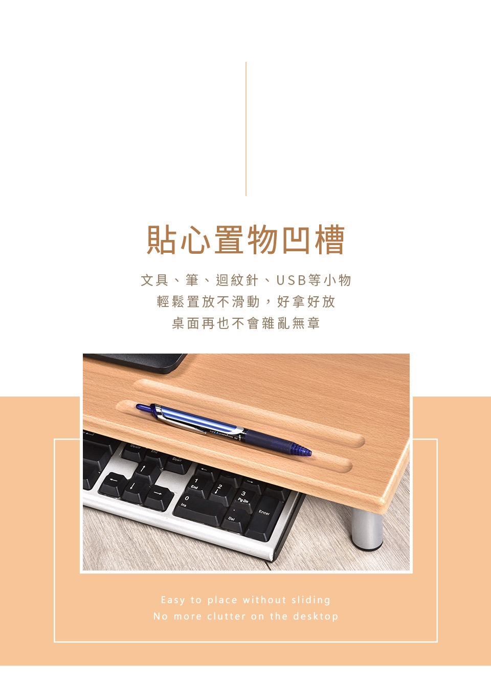 桌面也更乾淨了!上下兩層的活用空間,鍵盤、滑鼠、文件等物品通通收進螢幕架下,讓您的桌面保持清爽,一目了然。