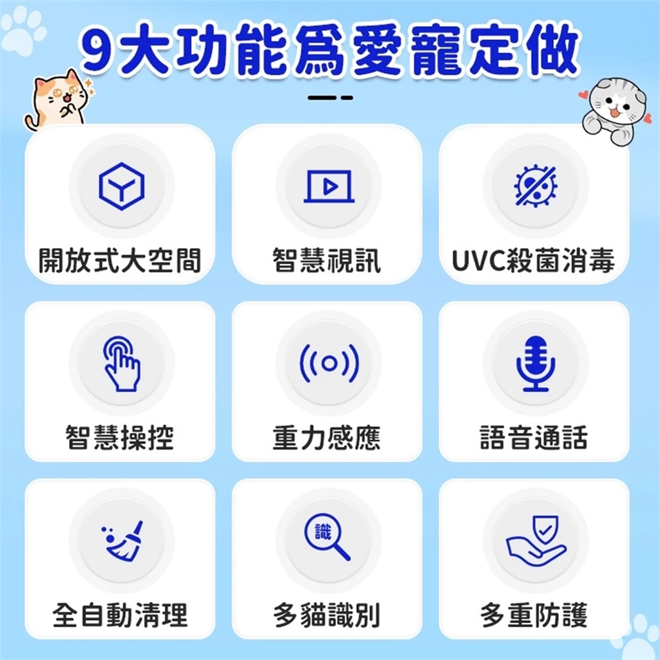 ——貓咪進入貓砂盆後開始如廁,如廁結束後紅外線感應貓咪離開.高敏紅外對管識別貓咪識別率99%以上識別後,緊急製動鏟耙停止工作.觸碰製動鏟耙回程中遇到貓咪緊急製動停止工作,1kg的小貓咪,也能讓它停下.雙紅外對射+霍爾觸碰感應+重力識別,三重保護裝置(可設置1/5/10/15/20等分鐘定時清理,讓貓砂可以包裹均勻,吸幹水分一鏟即凈.