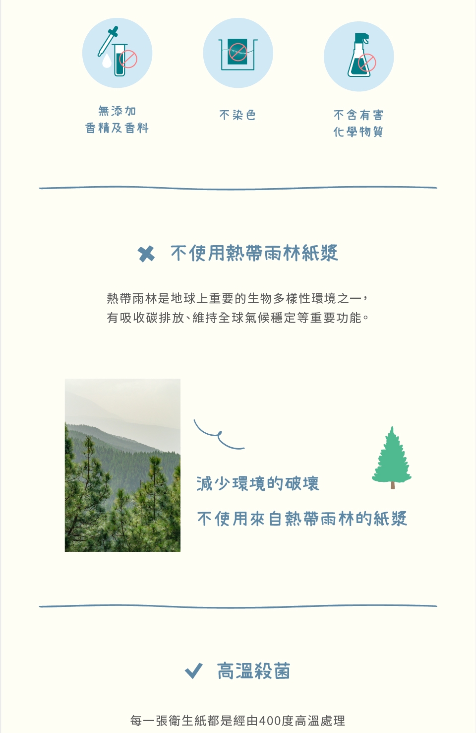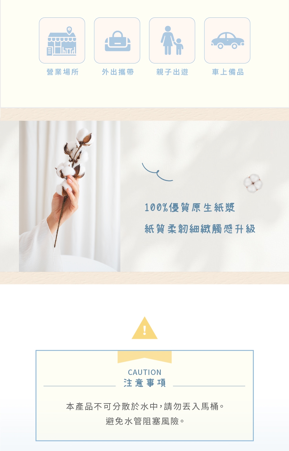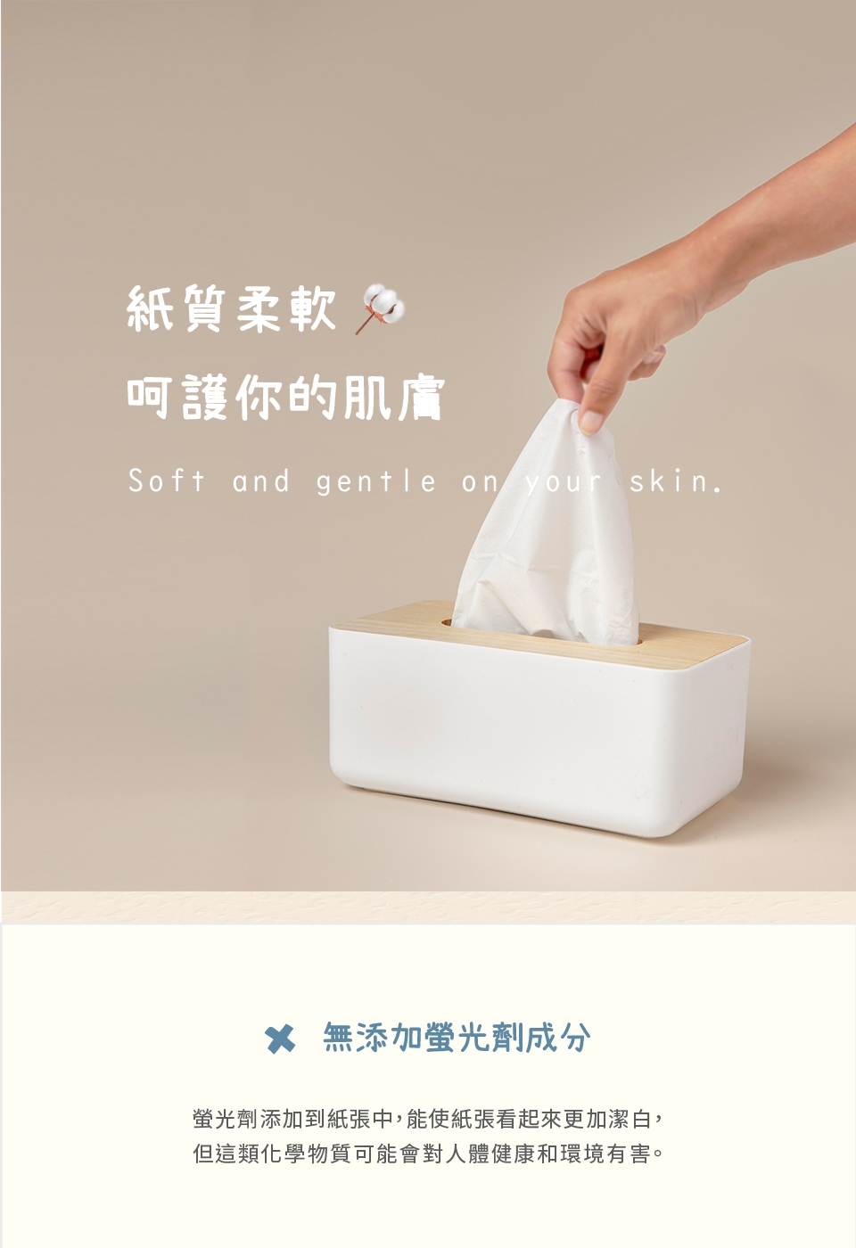 100%原生紙漿,堅持不使用熱帶雨林紙漿成分,不含有害化學物質、無添加螢光劑,紙質柔軟觸感升級,