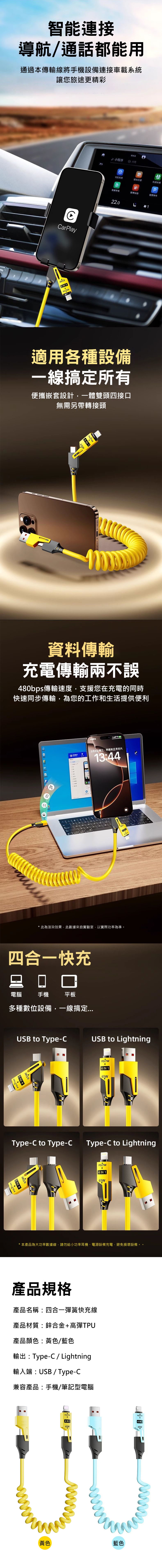 ◆產品名稱:四合一彈簧快充線