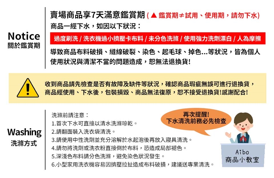 ◎本體釘掛吊牌之審閱期標籤,除商品本身有瑕疵(染色牢度差、車縫不良、髒污、破損、缺配件)可辦理退換貨,若審閱期標籤拆下損毀或是人為污損(經使用造成的髒污、破損或勾紗)或經過洗滌,即無法退貨。