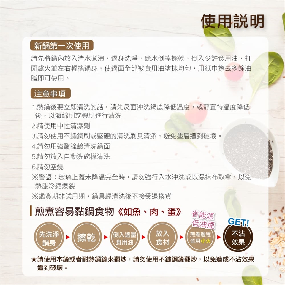 1.不可使用金屬鏟具及洗具,亦避免炒硬殼類食材,避免破壞塗層。