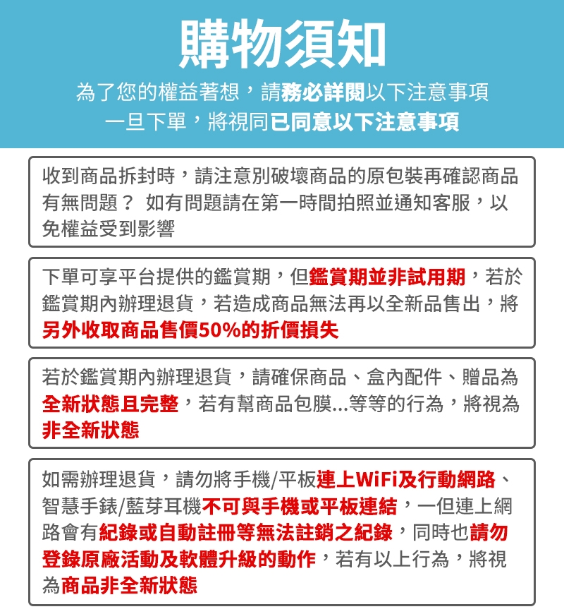 - 鑑賞期內請保持商品/配件/贈品的完整性 (包裝不可破損,不可包膜,商品不可磨損刮傷)