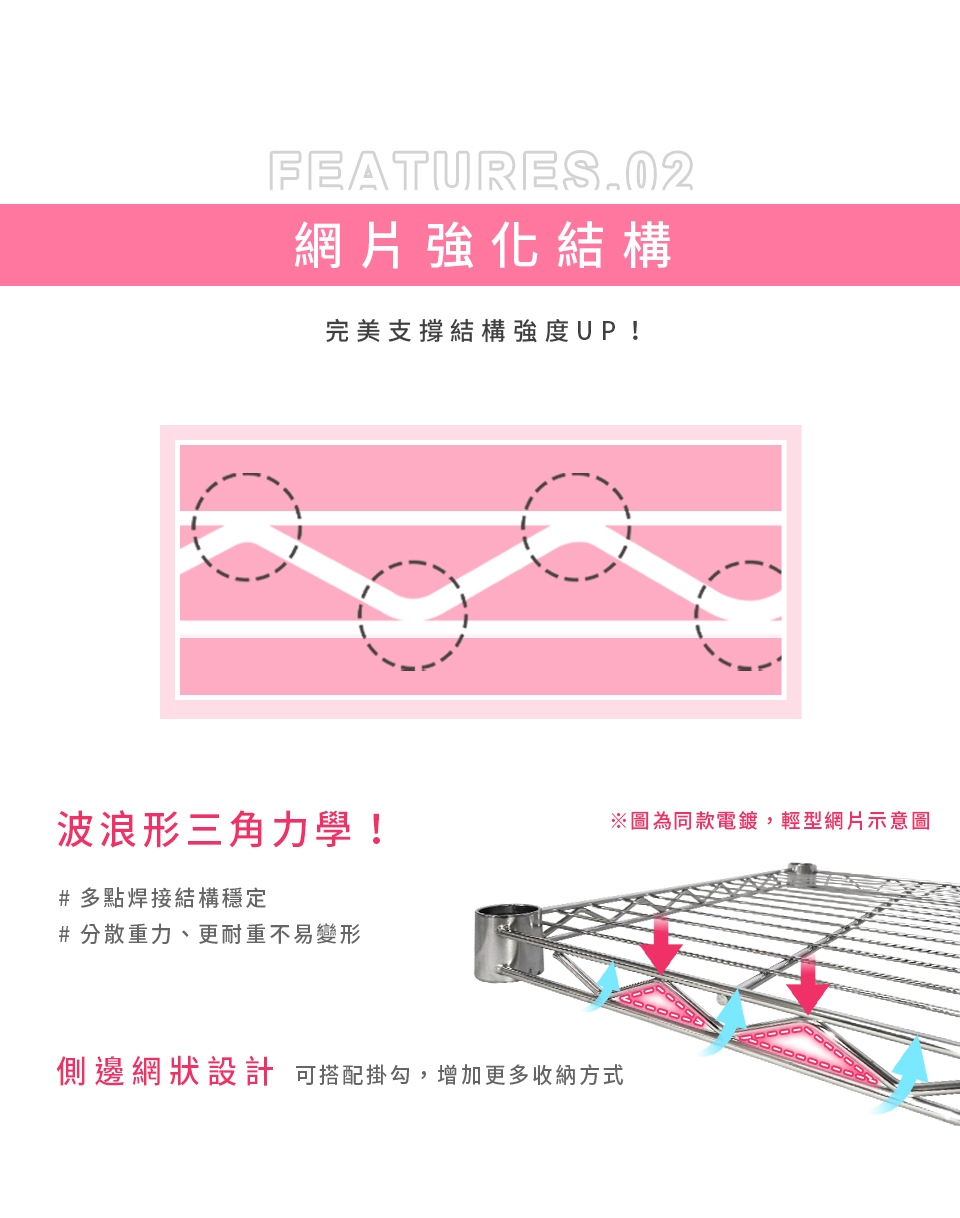 ✓ 高承重層網,單層靜態平均荷重可達180kg,安心放置、穩固耐用。
