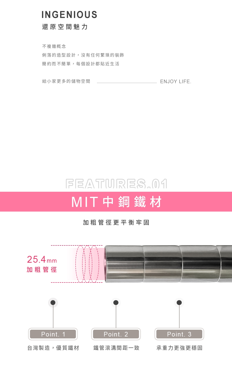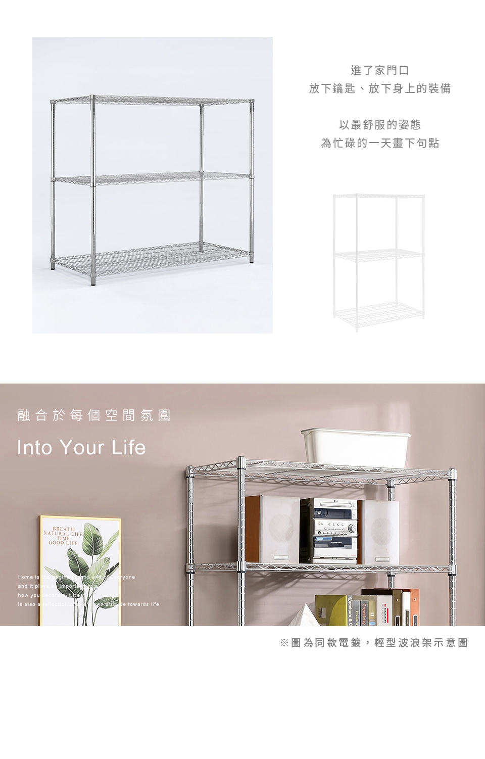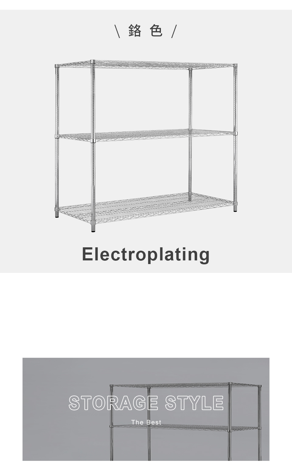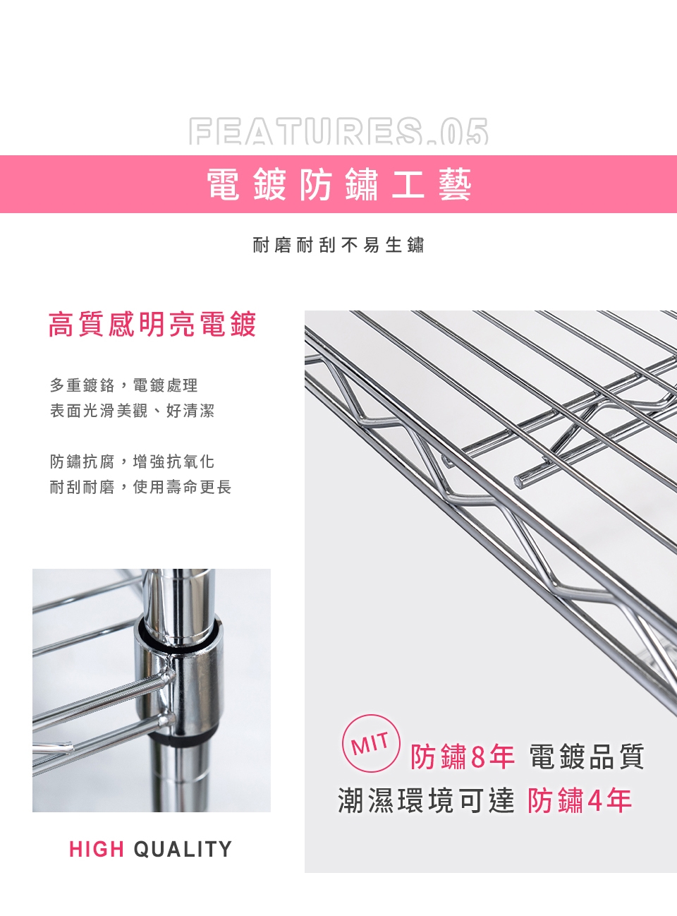 質感鐵力士層架,嚴選MIT中鋼鐵材,表面多重鍍銘、電鍍處理,呈現高質感明亮色澤,防鏽抗腐蝕、承重力強,堅固耐用!