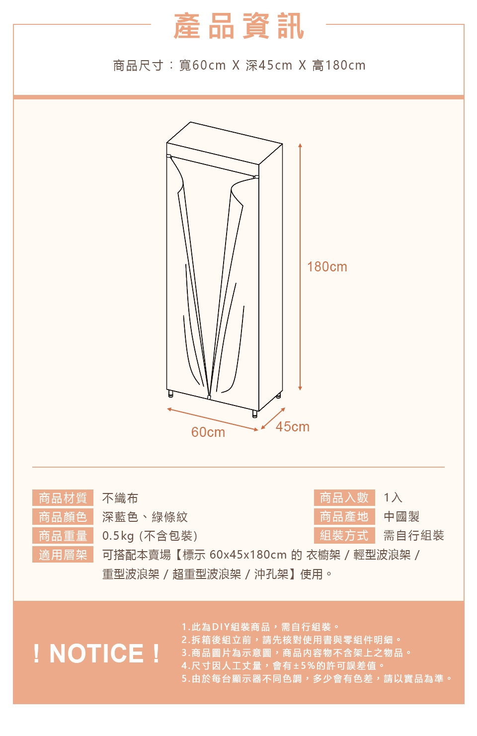 適用層架:可搭配本賣場【標示 60x45x180cm 的 衣櫥架 / 輕型波浪架 / 重型波浪架 / 超重型波浪架 / 沖孔架】使用。