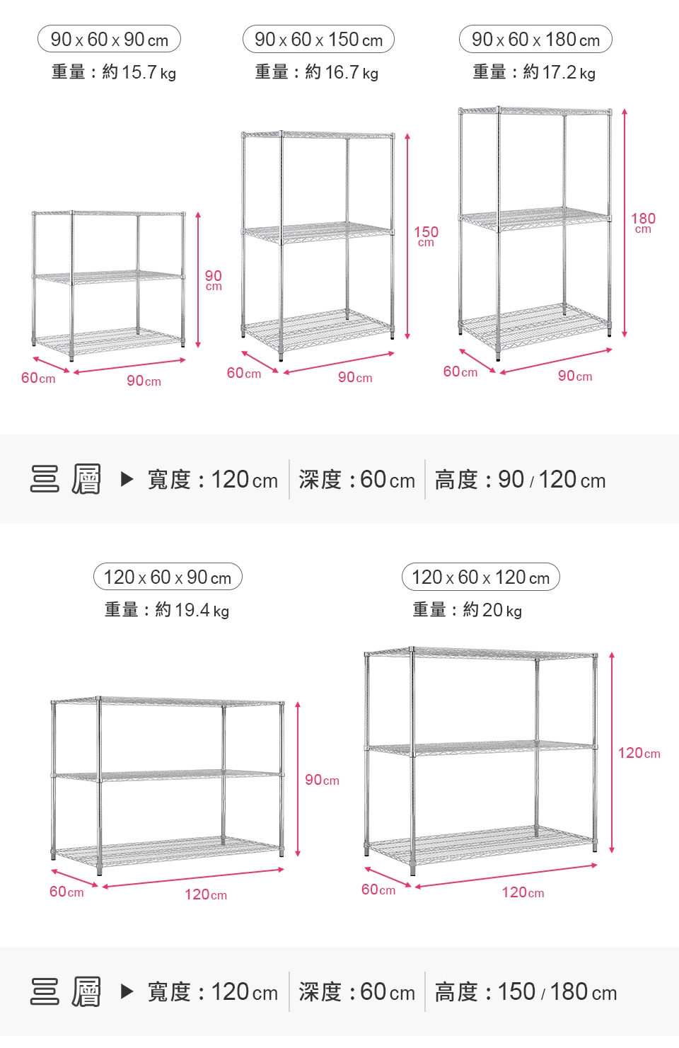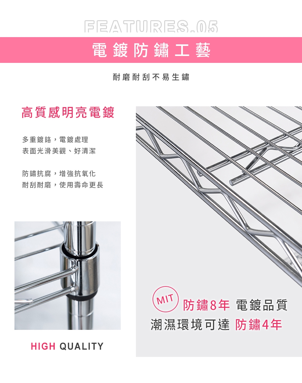 質感鐵力士層架,嚴選MIT中鋼鐵材,表面多重鍍銘、電鍍處理,呈現高質感明亮色澤,防鏽抗腐蝕、承重力強,堅固耐用!