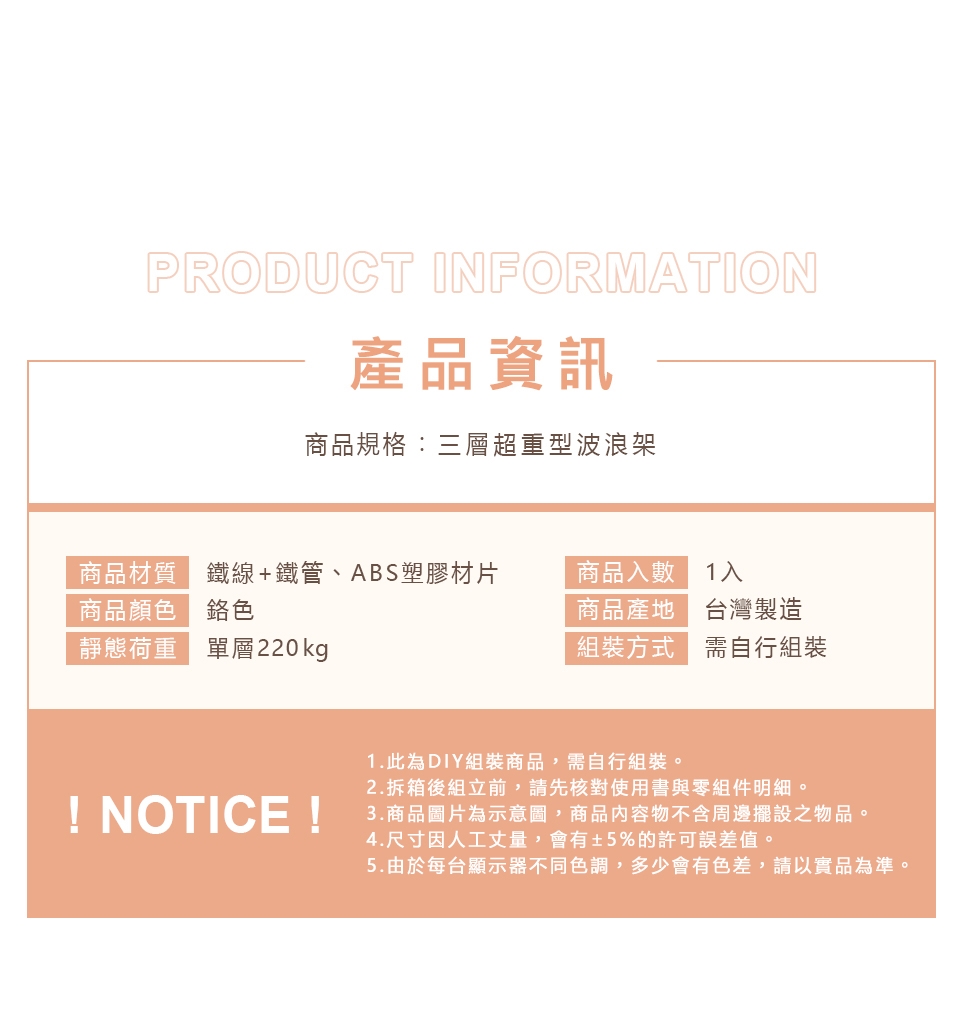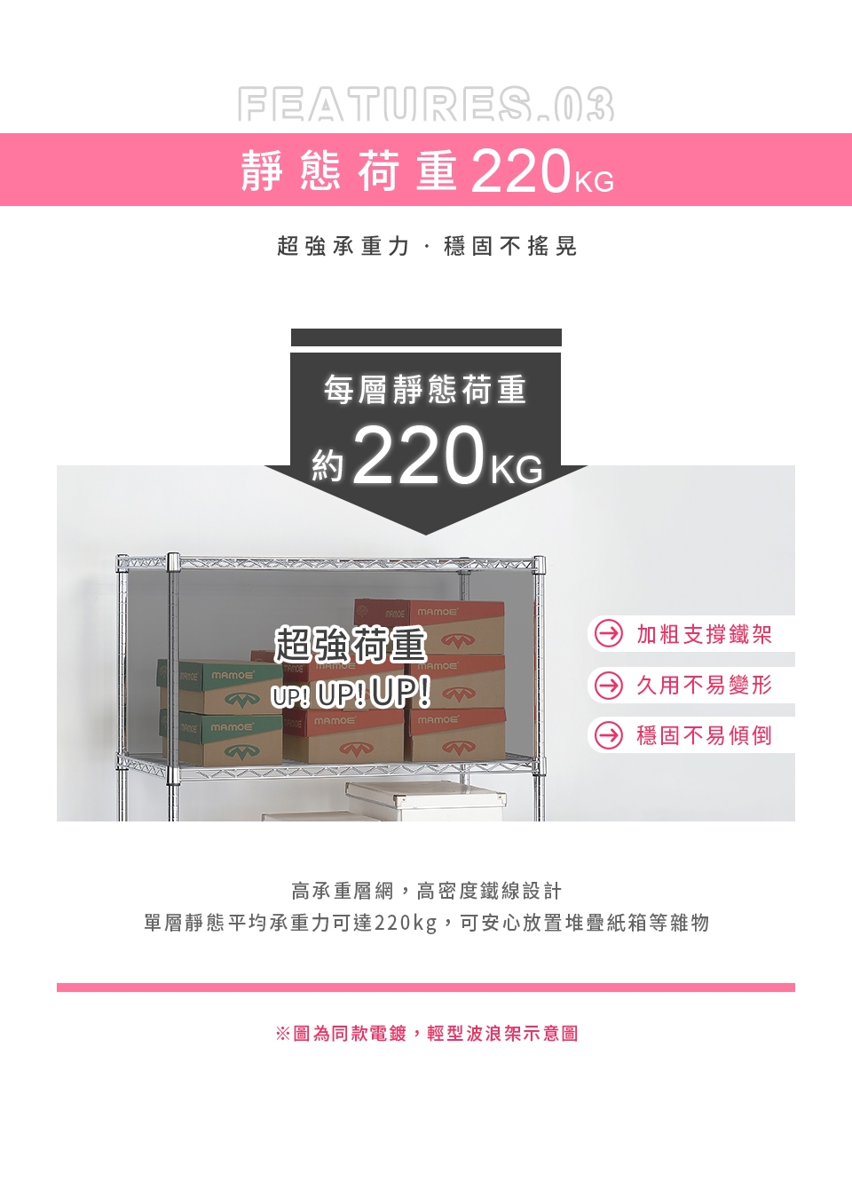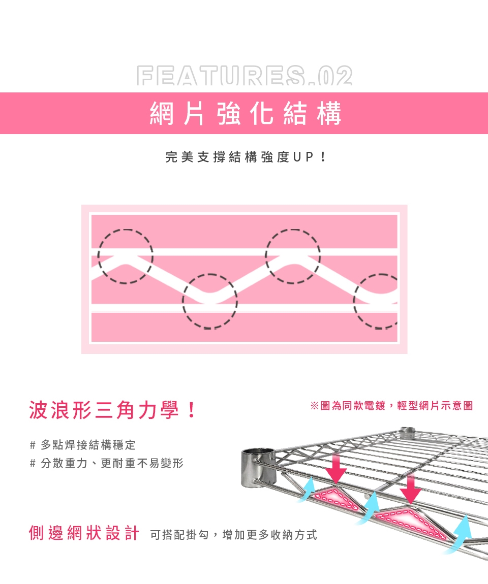 ✓ 高承重層網,單層靜態平均荷重可達220kg,安心放置、穩固耐用。